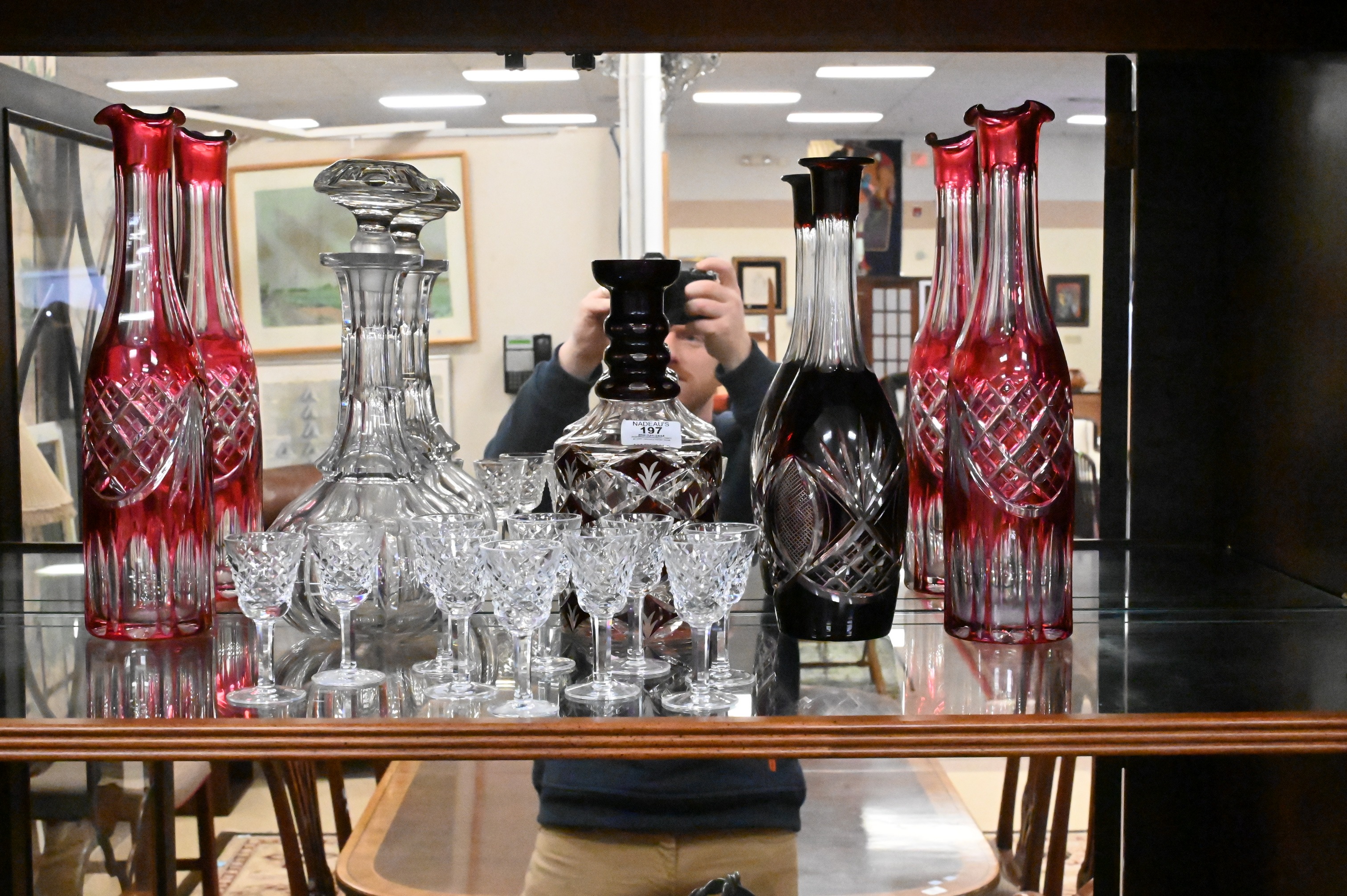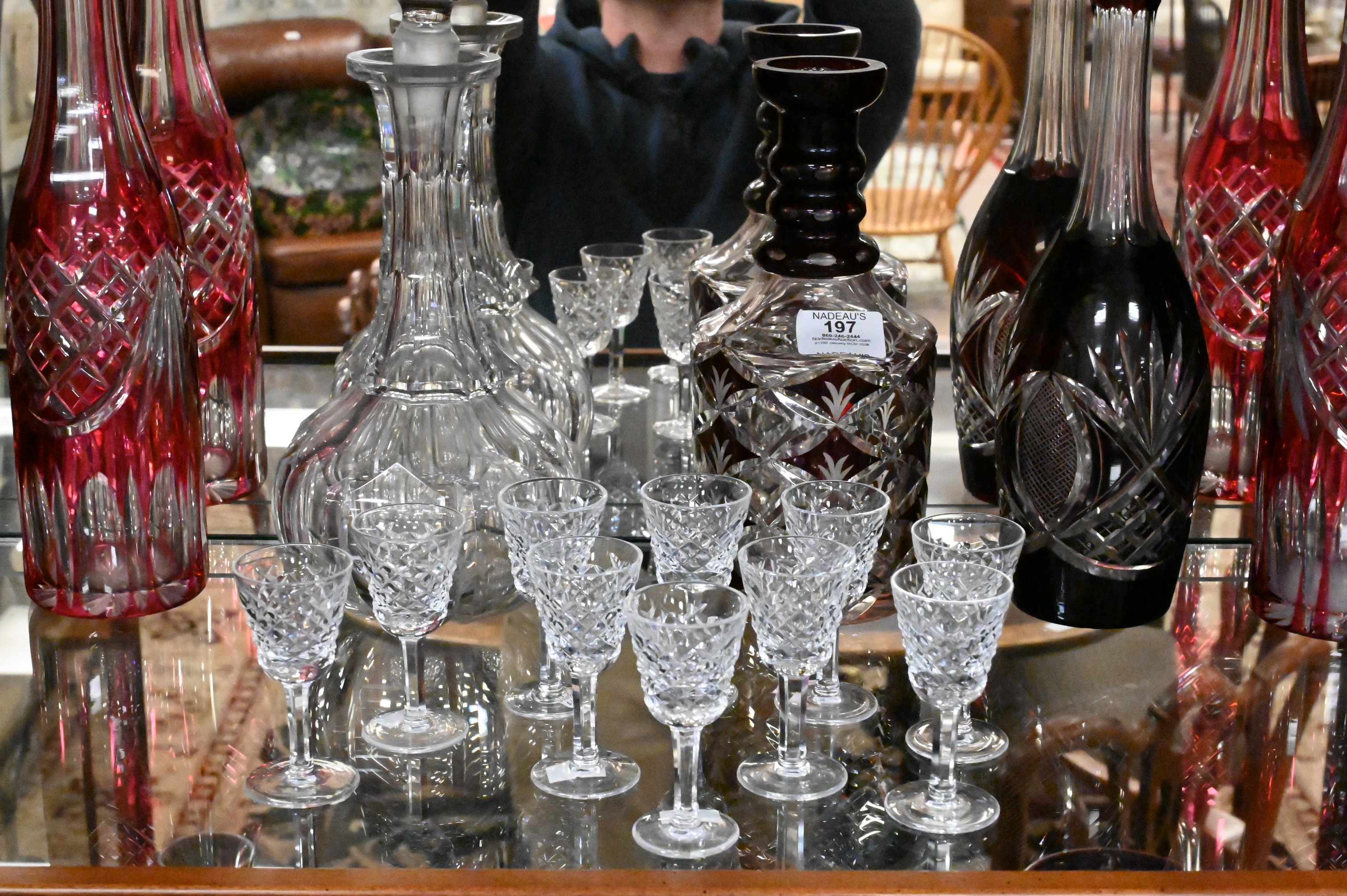 including several decanters with stoppers, ruby and cranberry examples, and a cut overlay bottle, together with a set of Waterford crystal stem glasses with diamond-cut bowls and faceted stems