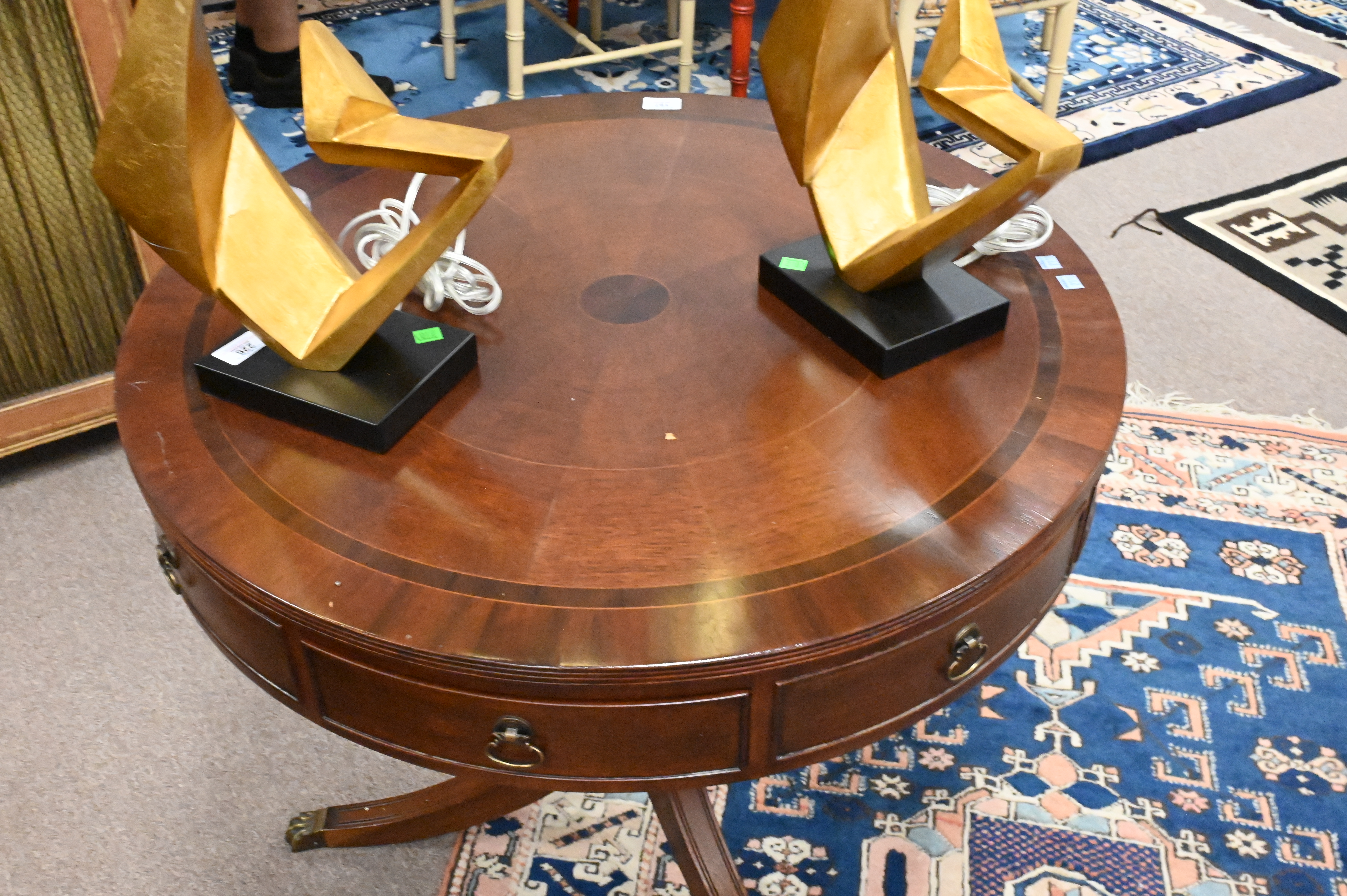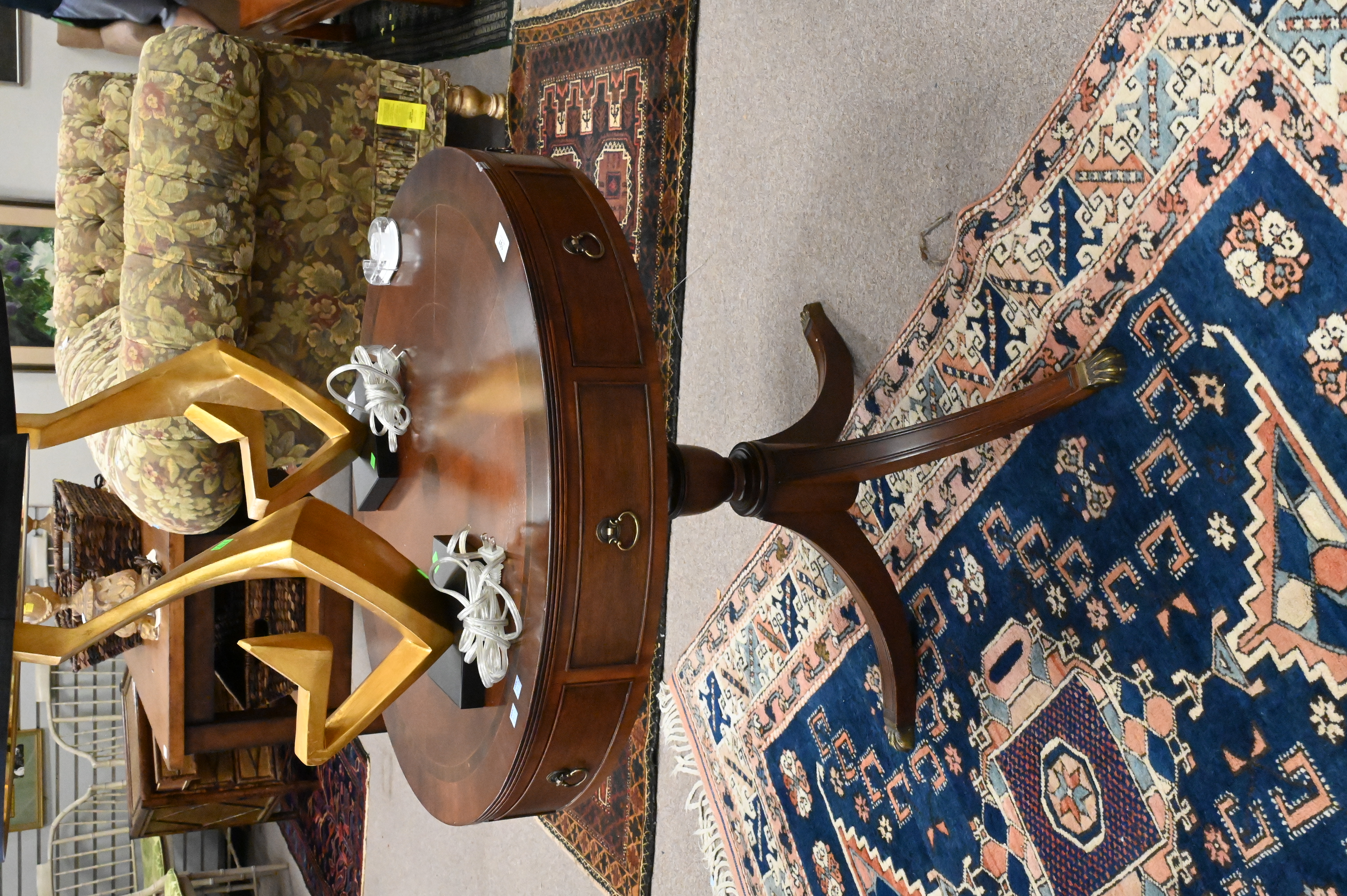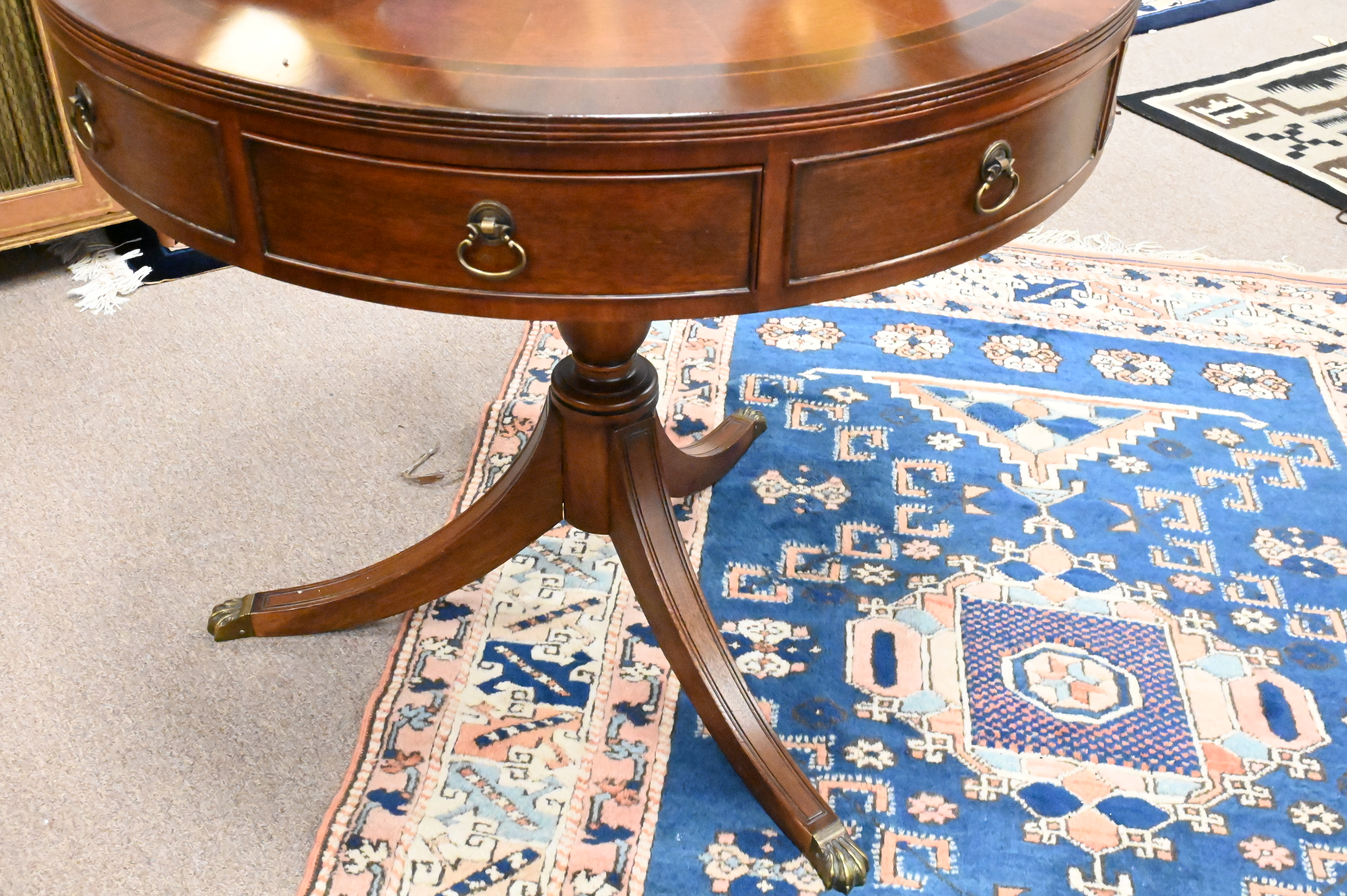 Custom Mahogany Drum Table, with revolving inlaid top, marked Thomas Amato Co., height 29 inches, diameter 32 inches.