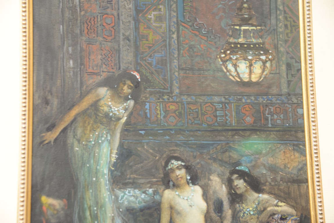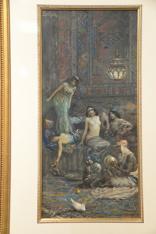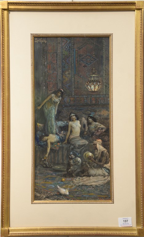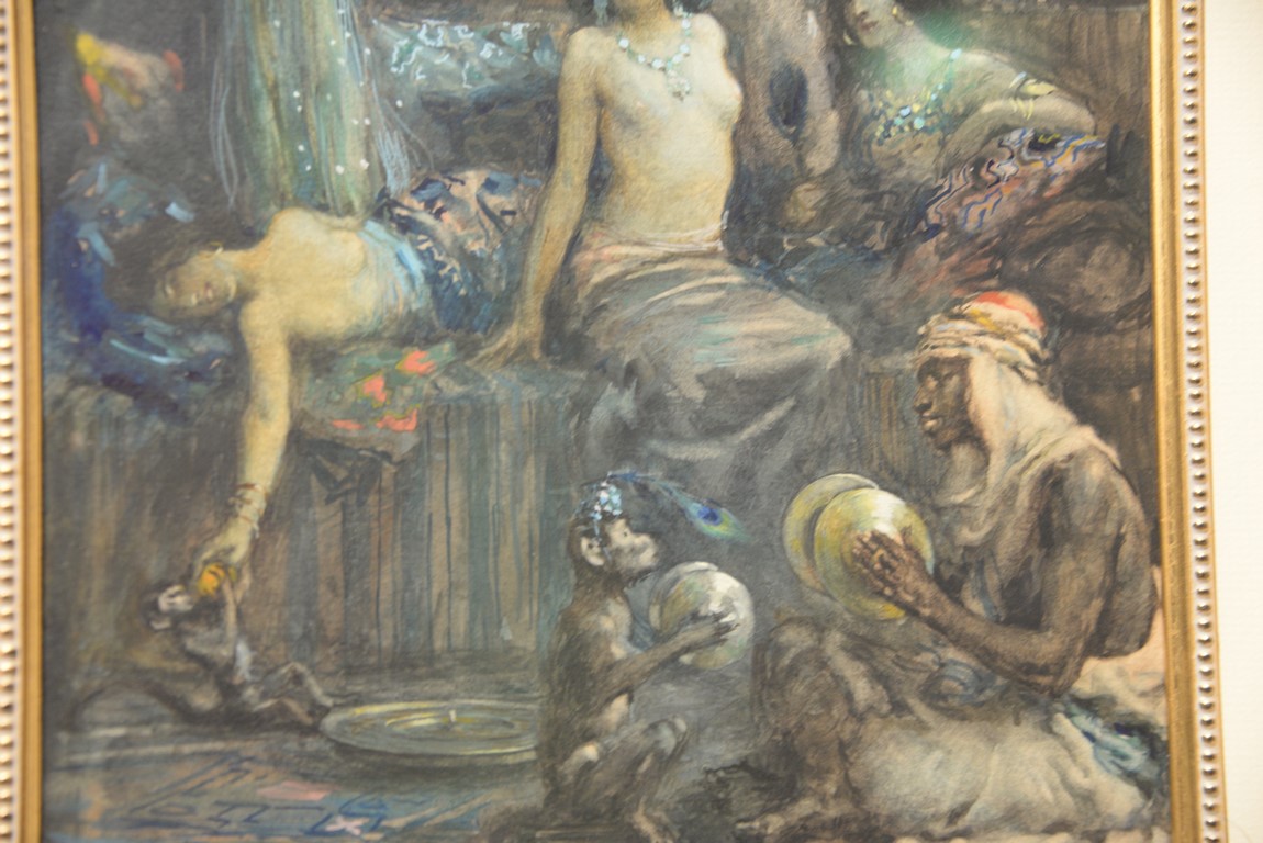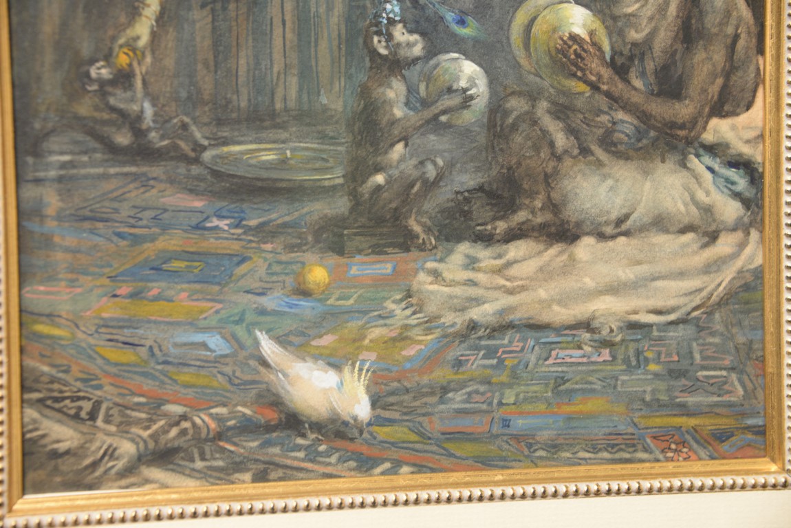 Lot 197: Francis Luis Mora 1874-1940 Oriental Interior Scene Arabian Pastime watercolor / gouache on paper signed top left: F…