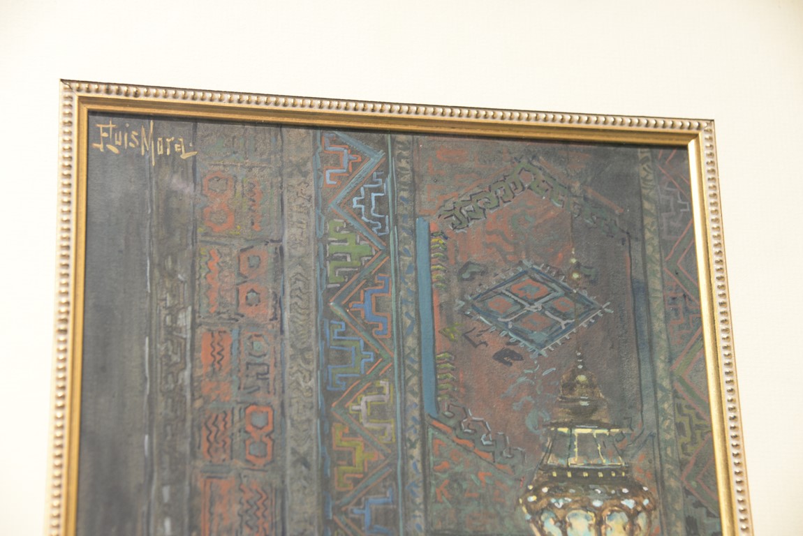 Francis Luis Mora 1874-1940 Oriental Interior Scene Arabian Pastime watercolor / gouache on paper signed top left: F. Luis Mora sight size: 19 1/4 x 9 1/4 Frederick Baker label on verso A very rare Orientalist painting by one of Connecticuts favorite early 20th century artists.This painting was painted on one of Moras trips to Spain to visit his extended family in the first years of the last century.Mora often liked to paint what was popular at the time he visited Spain.In later years he even dressed like a 8th century Spanish painter when he painted in his Connectiicut studio.In 1910 Mora had a one man show at the Watercolor Club of New York.This painting was in that exhibit and is the only Orientalist painting he seems to have painted.
