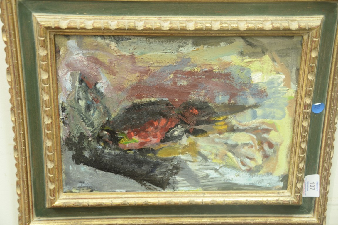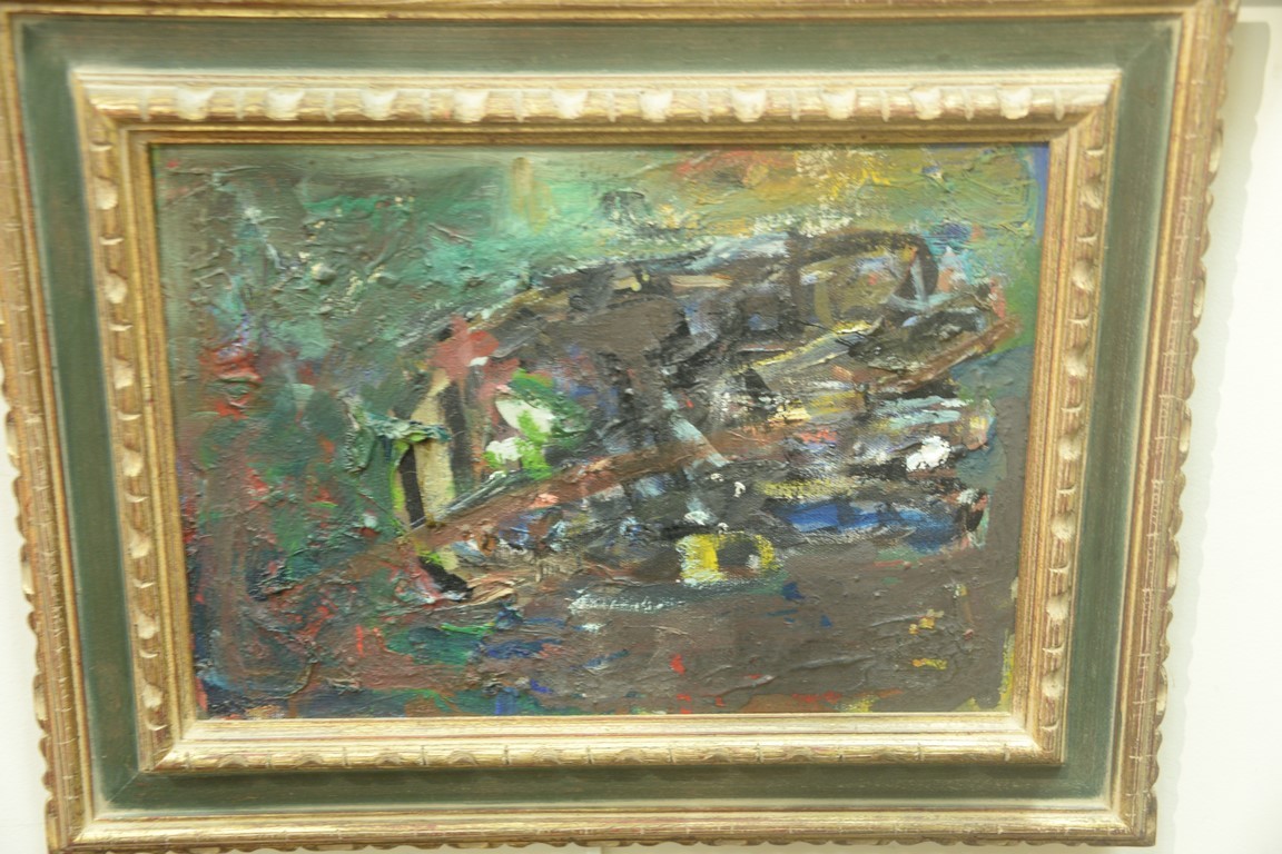 Lot 197: Grandy Brodie 1925-1975 pair of oil on canvas Abstract written and signed on reverse: For Ruth and Herman Stone with warm grati…