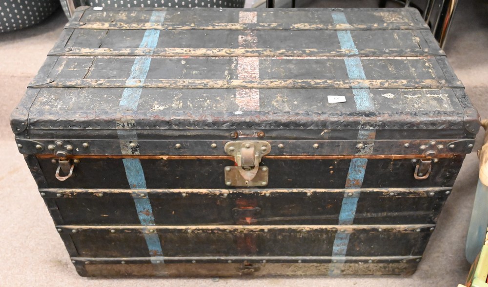 Louis Vuitton Painted Trunk, inside with staining and Louis Vuitton label, brass tacks and hardware stamped, height 25 inches, top 2…