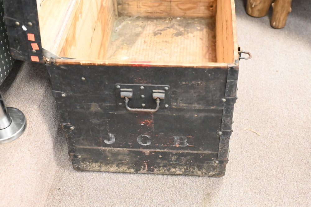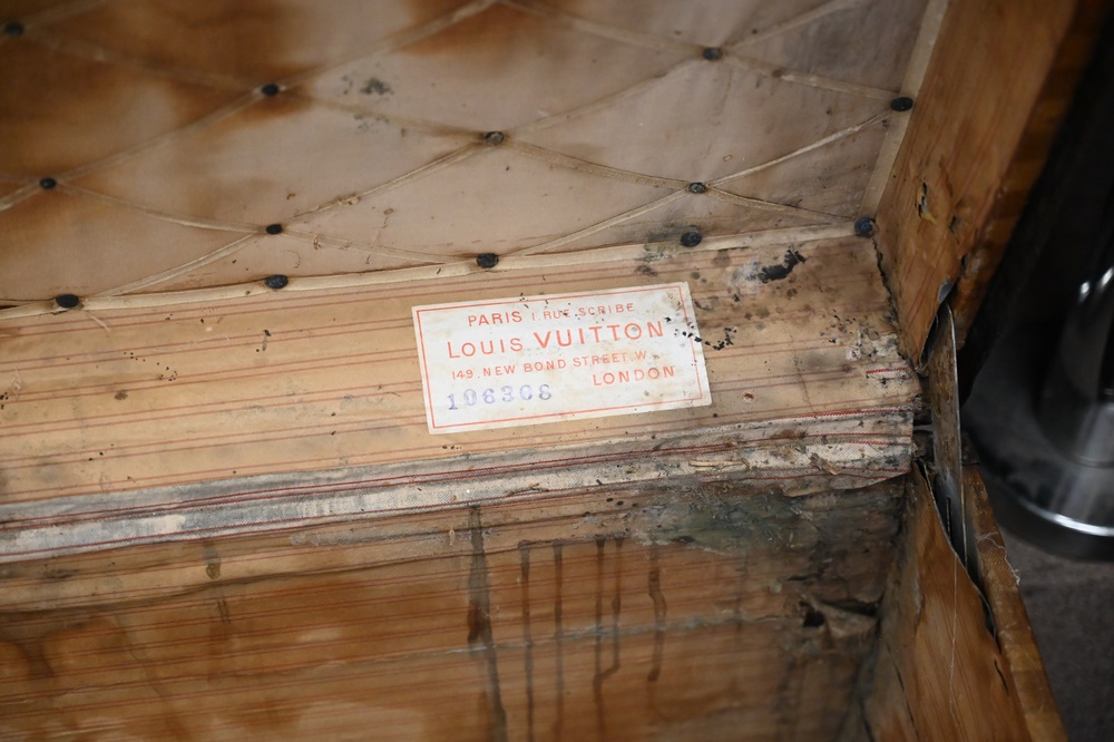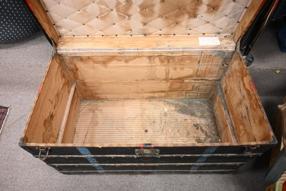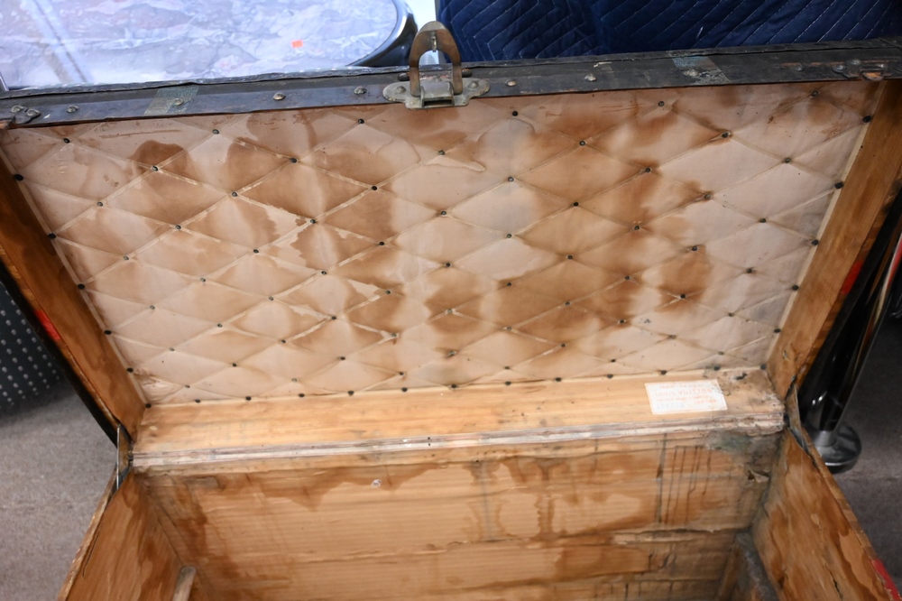 Lot 197: Louis Vuitton Painted Trunk, inside with staining and Louis Vuitton label, brass tacks and hardware stamped, height 25 inches, top 21 1/2″ x 39 1/2″.