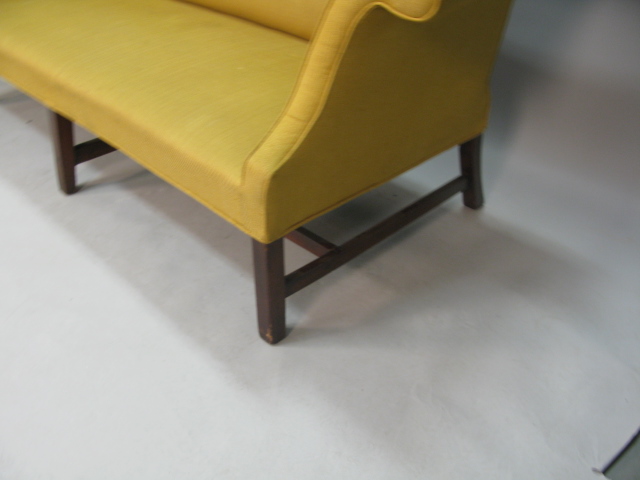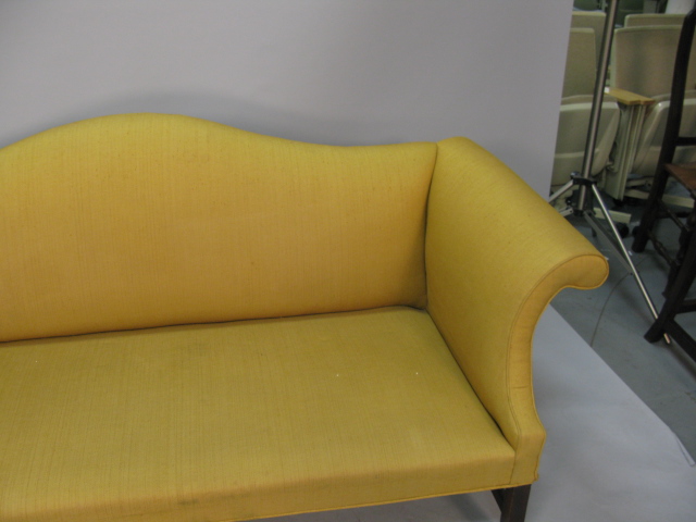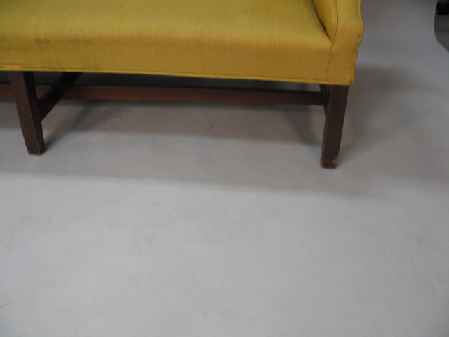 Mahogany Chippendale upholstered sofa with camelback, rolled arms on square legs with stretcher base.