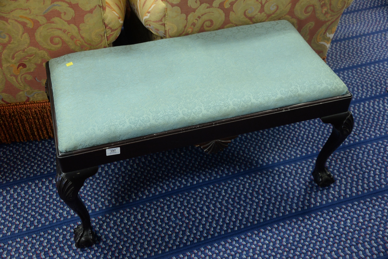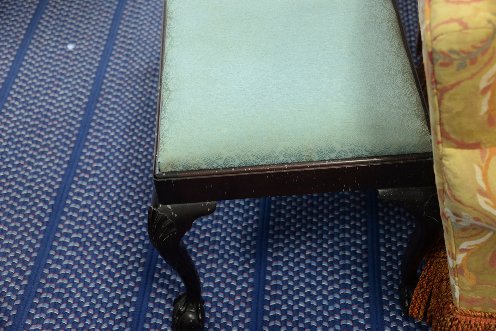 Lot 197: Potthast Furniture Chippendale Style Bench, having upholstered top and ball and claw feet, height 17 1/2 inches, length 33 1/2 inches, top 18″ x 35 1/2″.