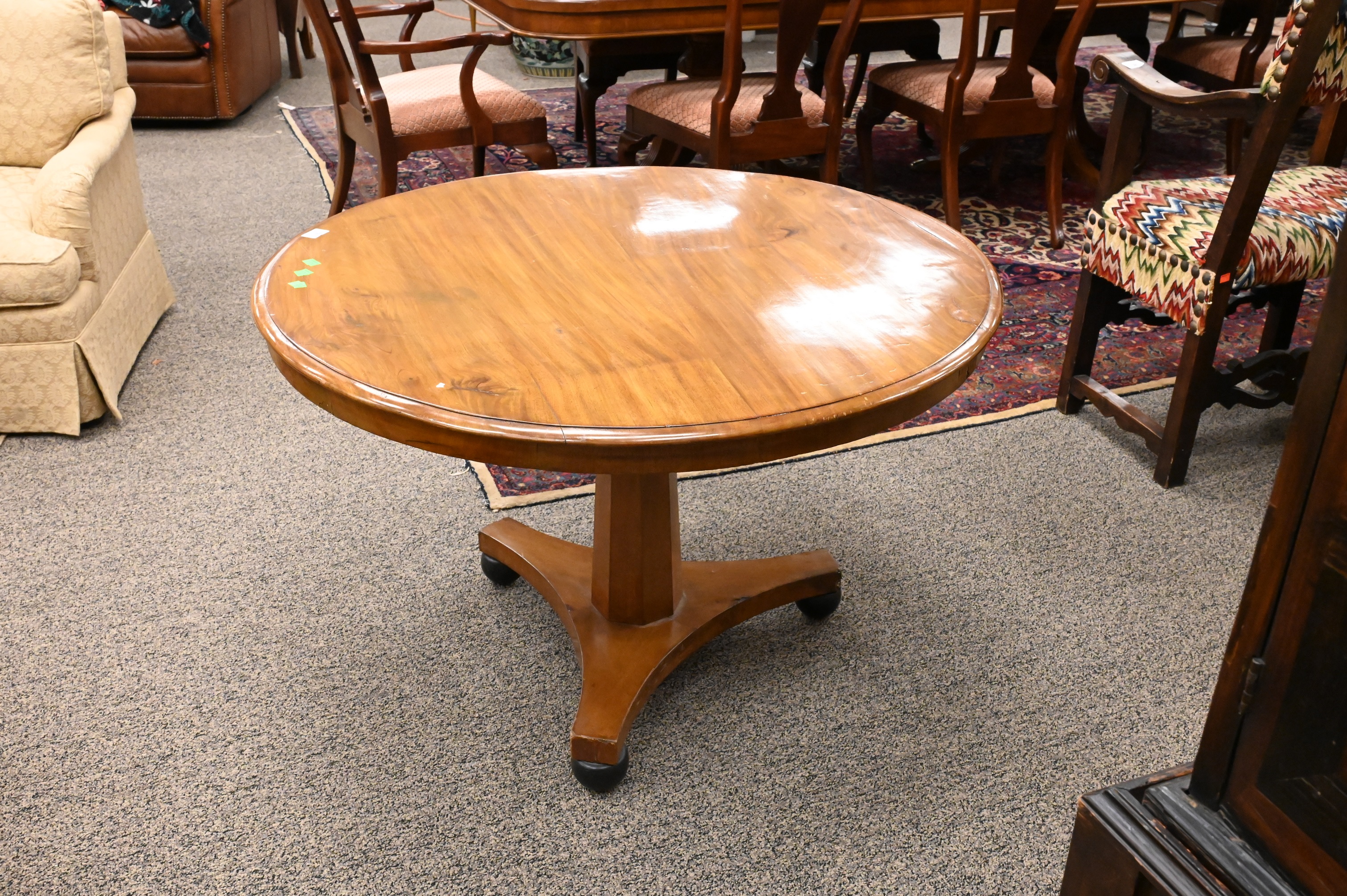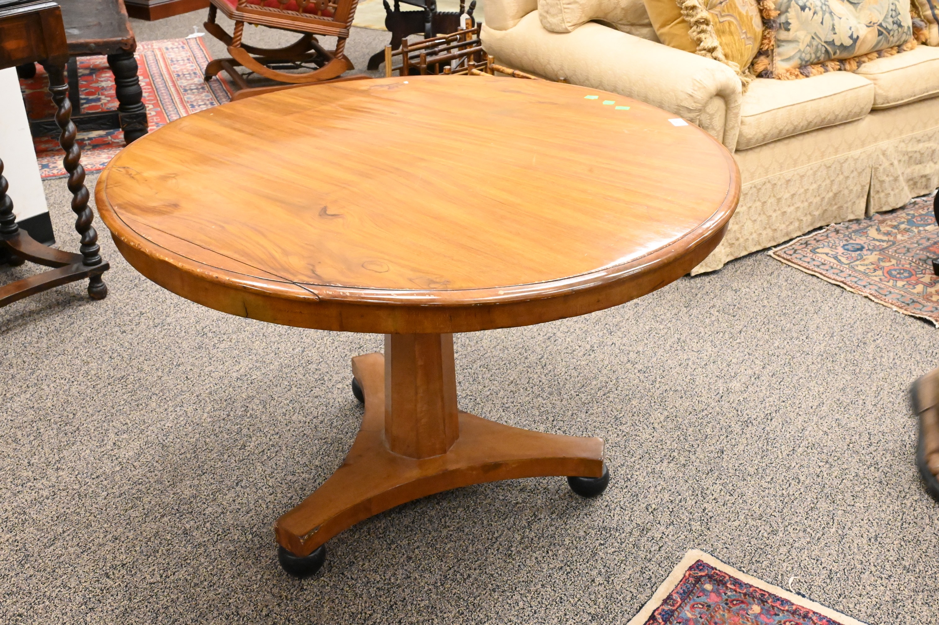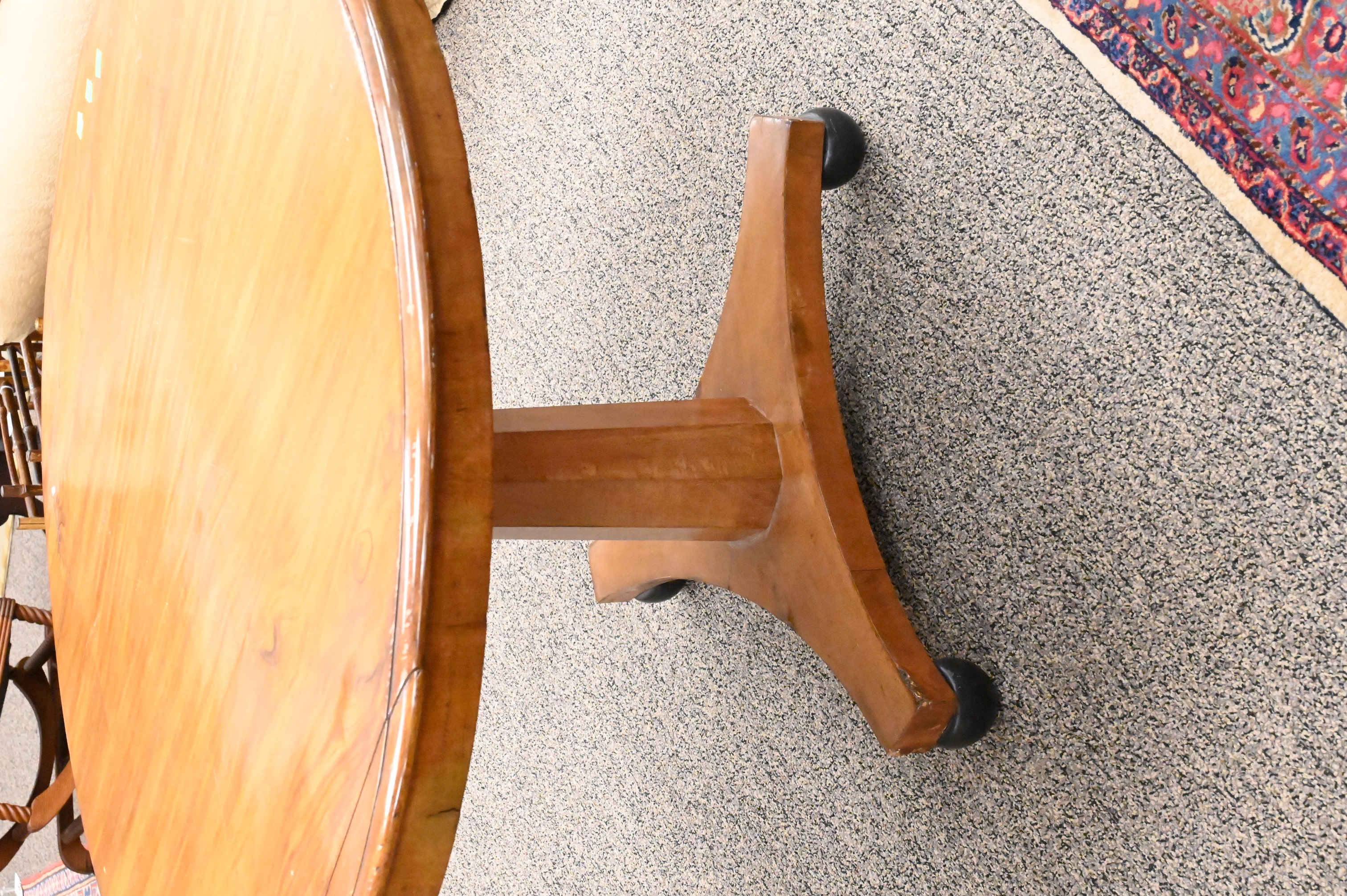 Round Wooden Center Table, on pedestal base, width 40 1/2 inches, height 26 3/4 inches
