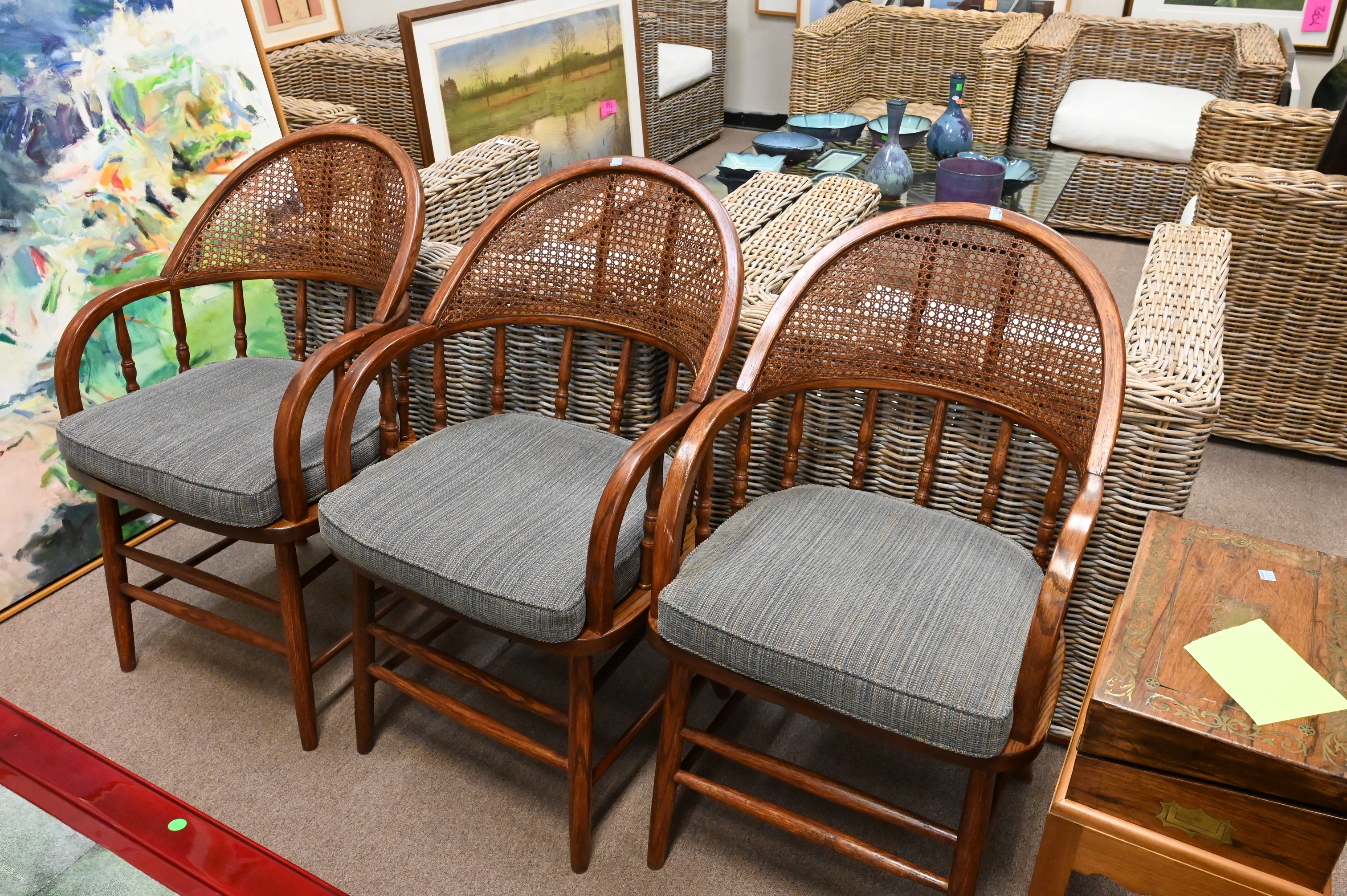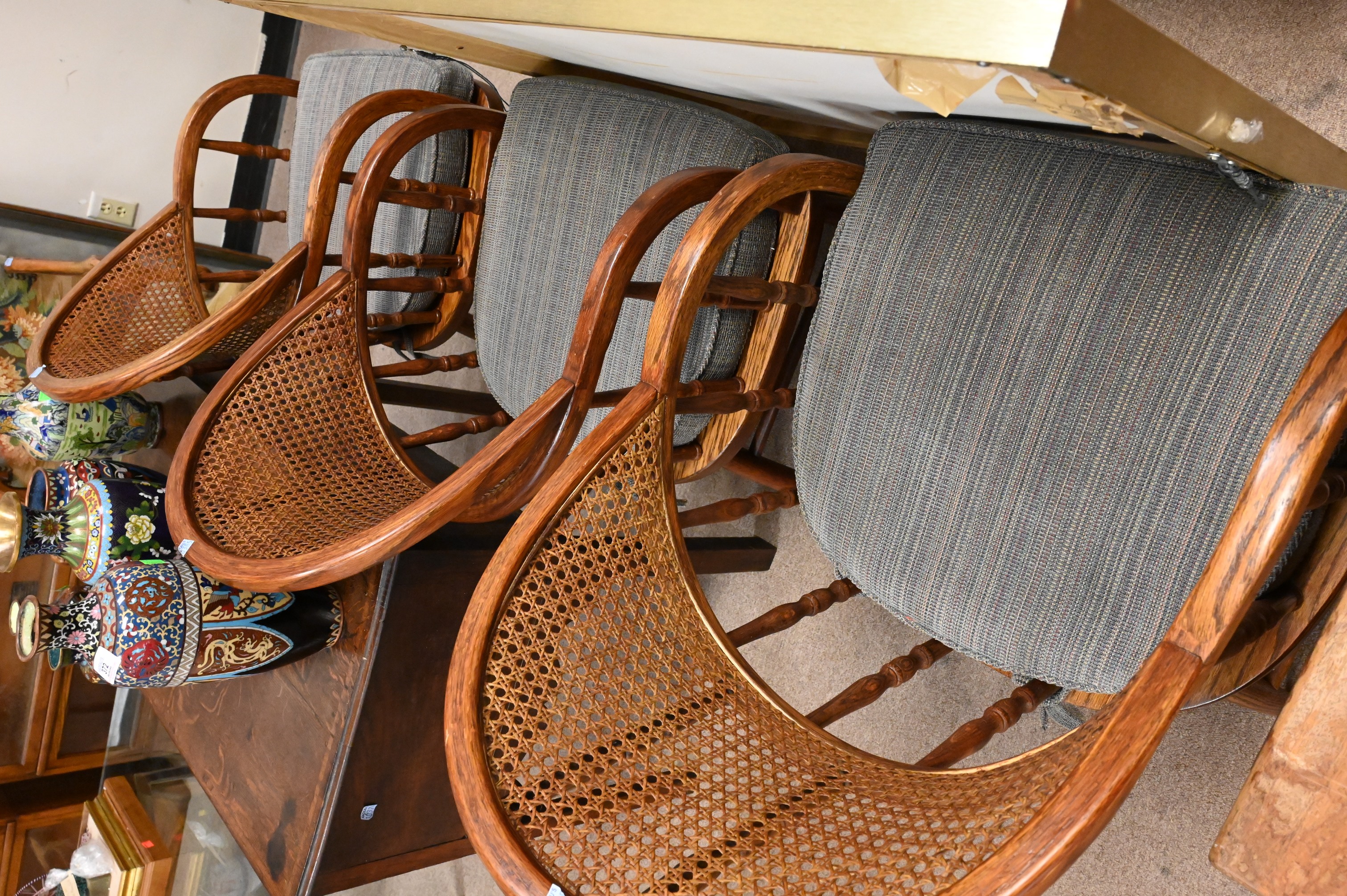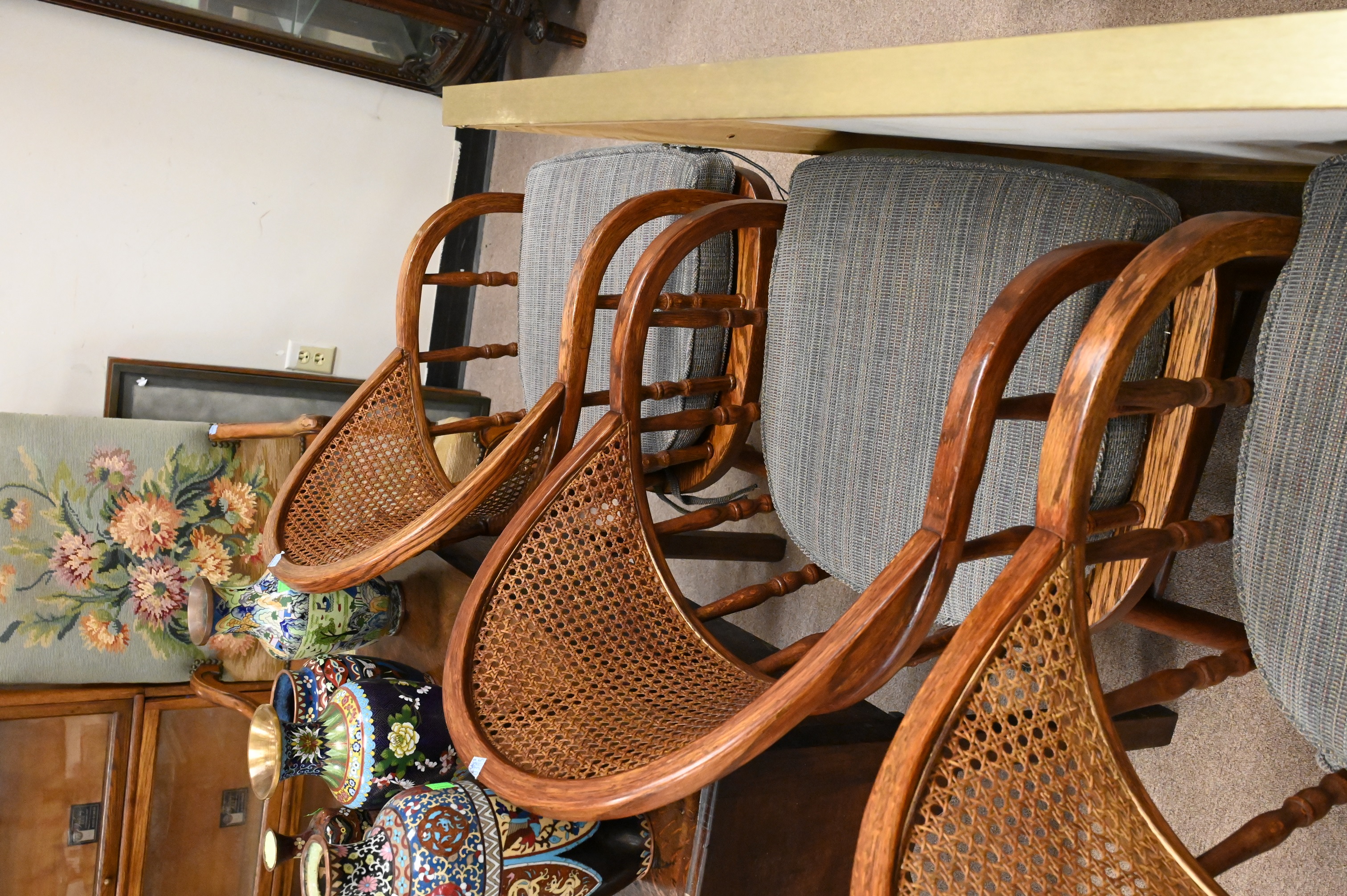 Lot 197: Set of Six Oak Bar Room Chairs having Caned Backs and Custom Upholstered Seats