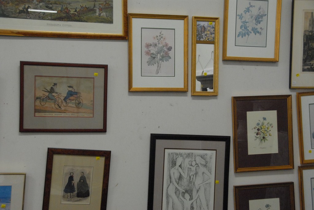 Lot 197: Seventeen piece lot contemporary candle sconce, 15 prints, and oval mirror