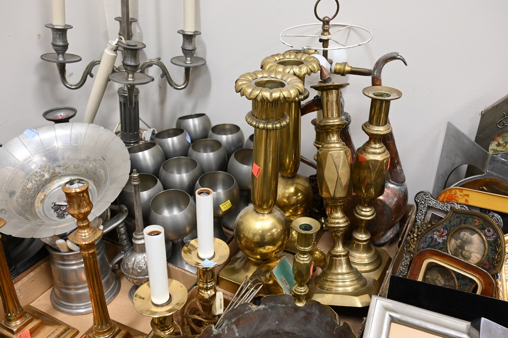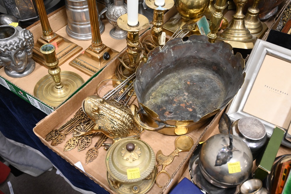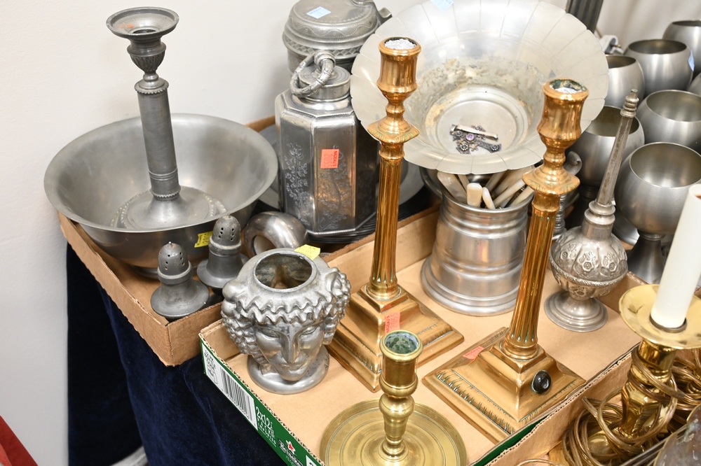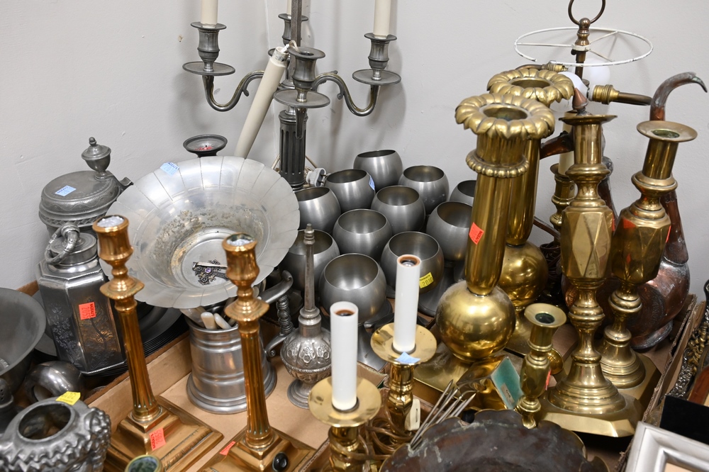 Lot 197: Six Tray Lots of Brass and Pewter, to include brass candlesticks, a pair of large brass push-up candlesticks, a pair of pewter candlesticks, bowls, along with tankard cups.