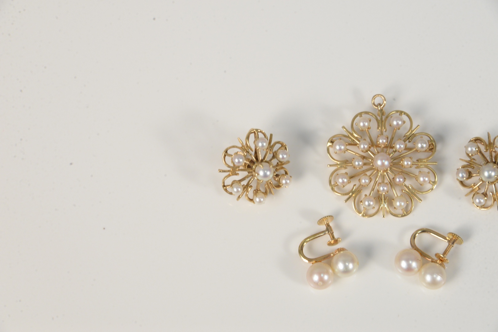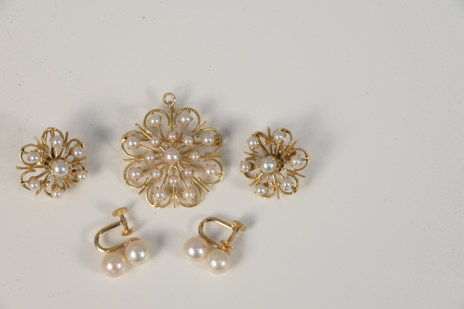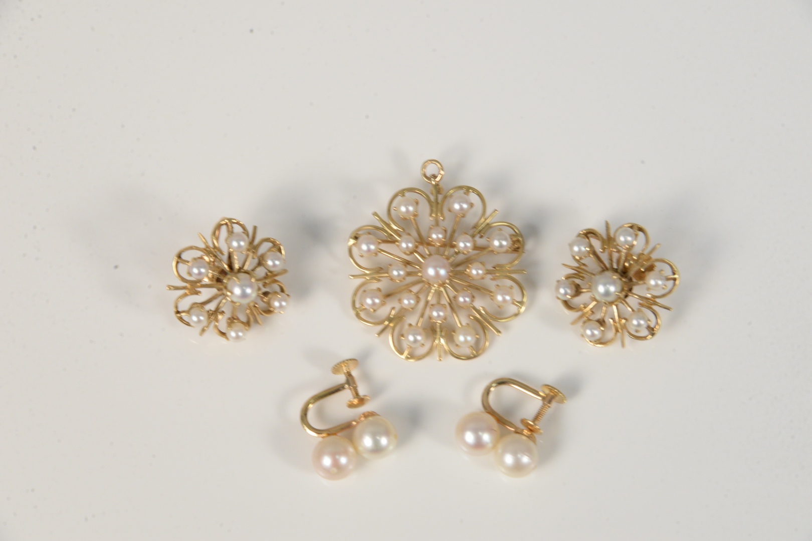 Three piece 14K gold and pearl lot to include two pairs screw back earrings, one brooch, total weight 20.7 gr. Provenance: Estate of Dr. Thomas & Alice Kugelman, Bloomfield, Connecticut.