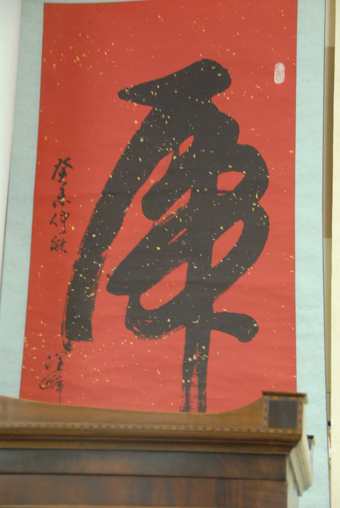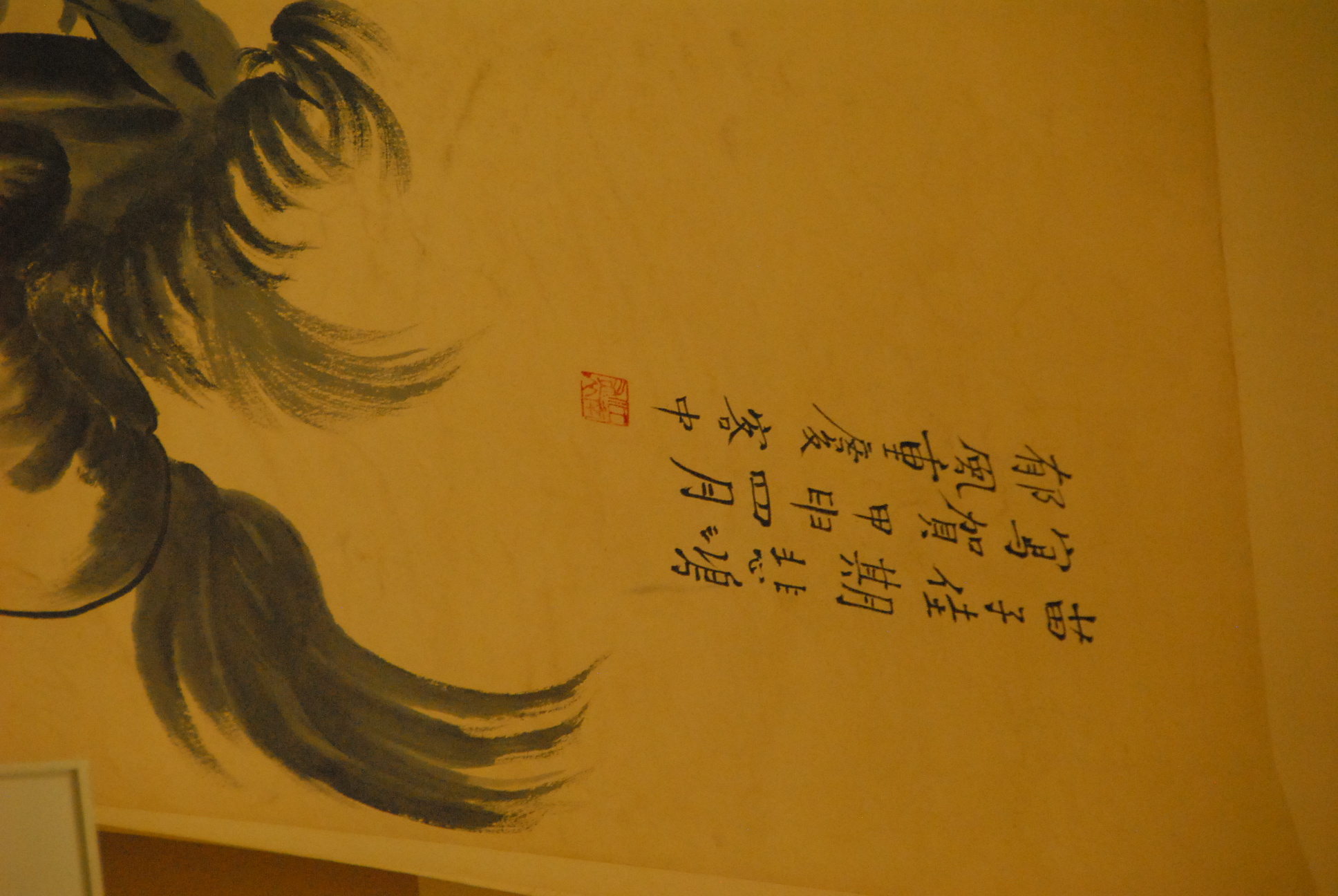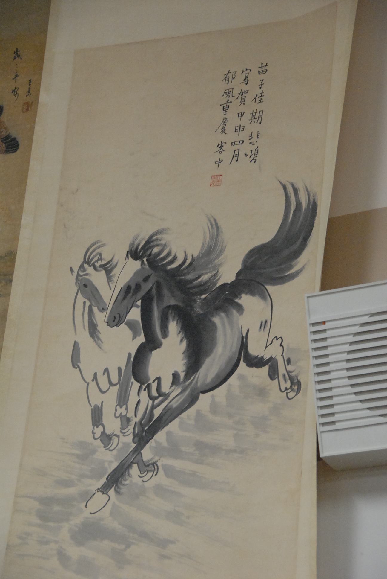 Lot 197: Two Oriental scrolls one of running horse 38 1/2 x 20 and the other of characters with red background 40 x 20.
