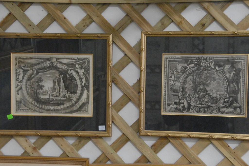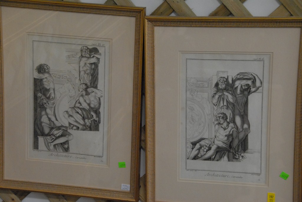 Lot 197: Two pairs of etchings Architectural Caratides etching marked Robert Benard Born 1734 and Rococo Biblical etchings Le Masacre Des …