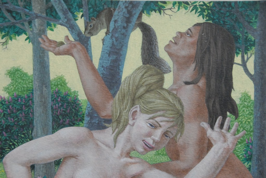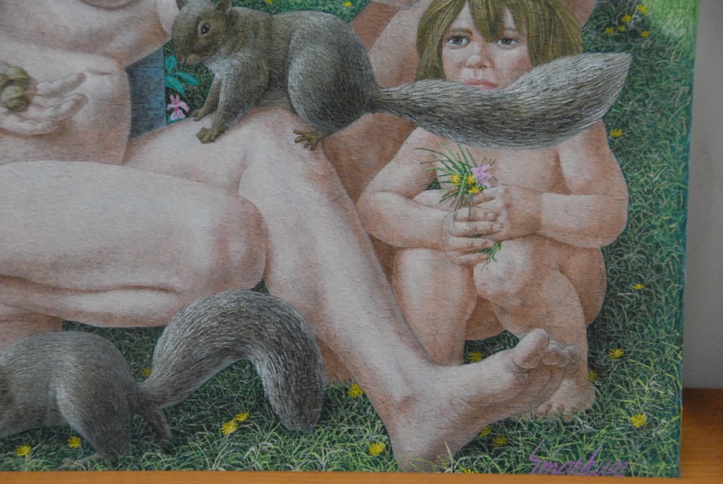 Vincent T. Smarkusz 1919-1974 oil on Masonite, nudes and squirrels in woods, 24 x 19.