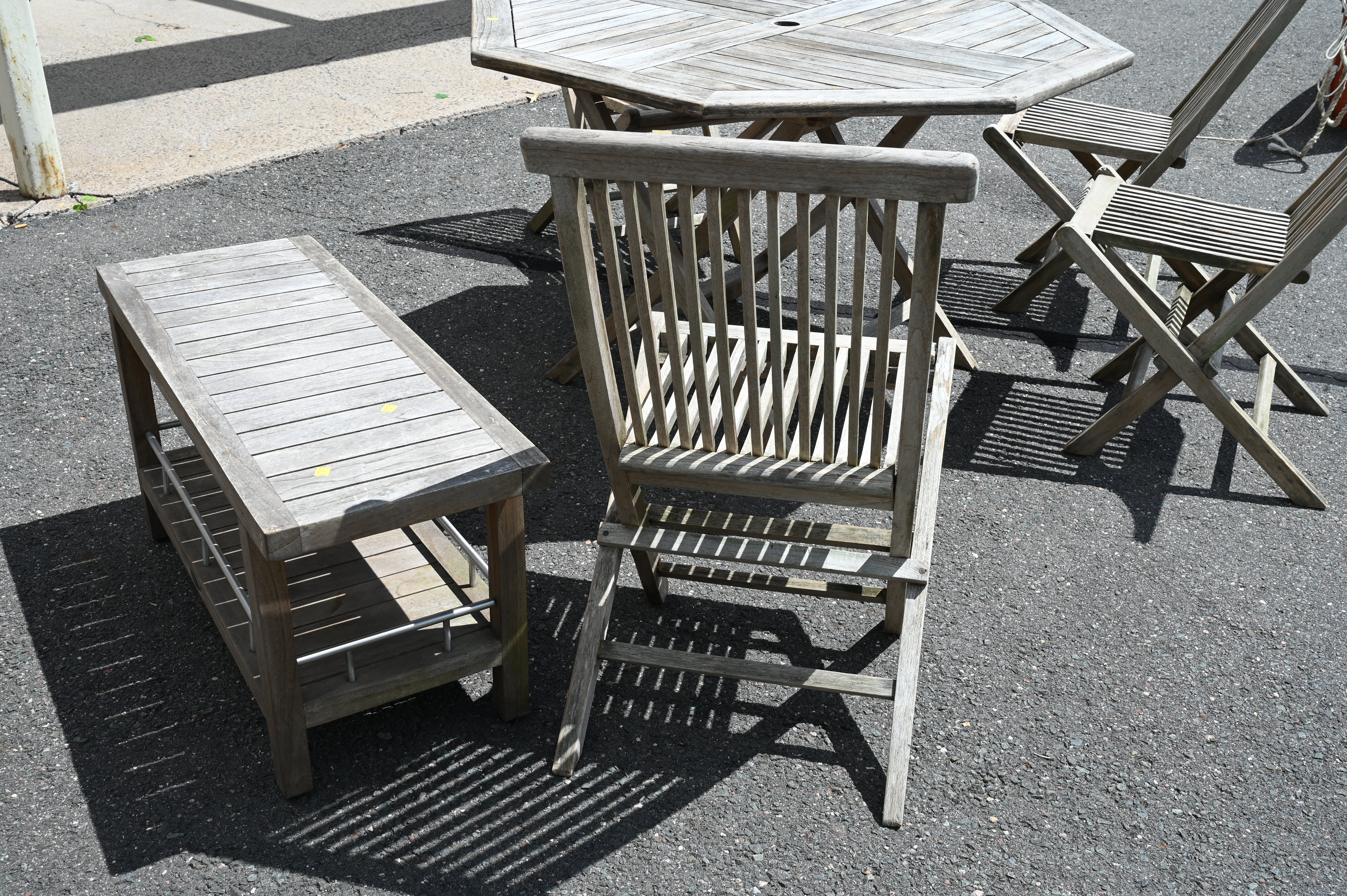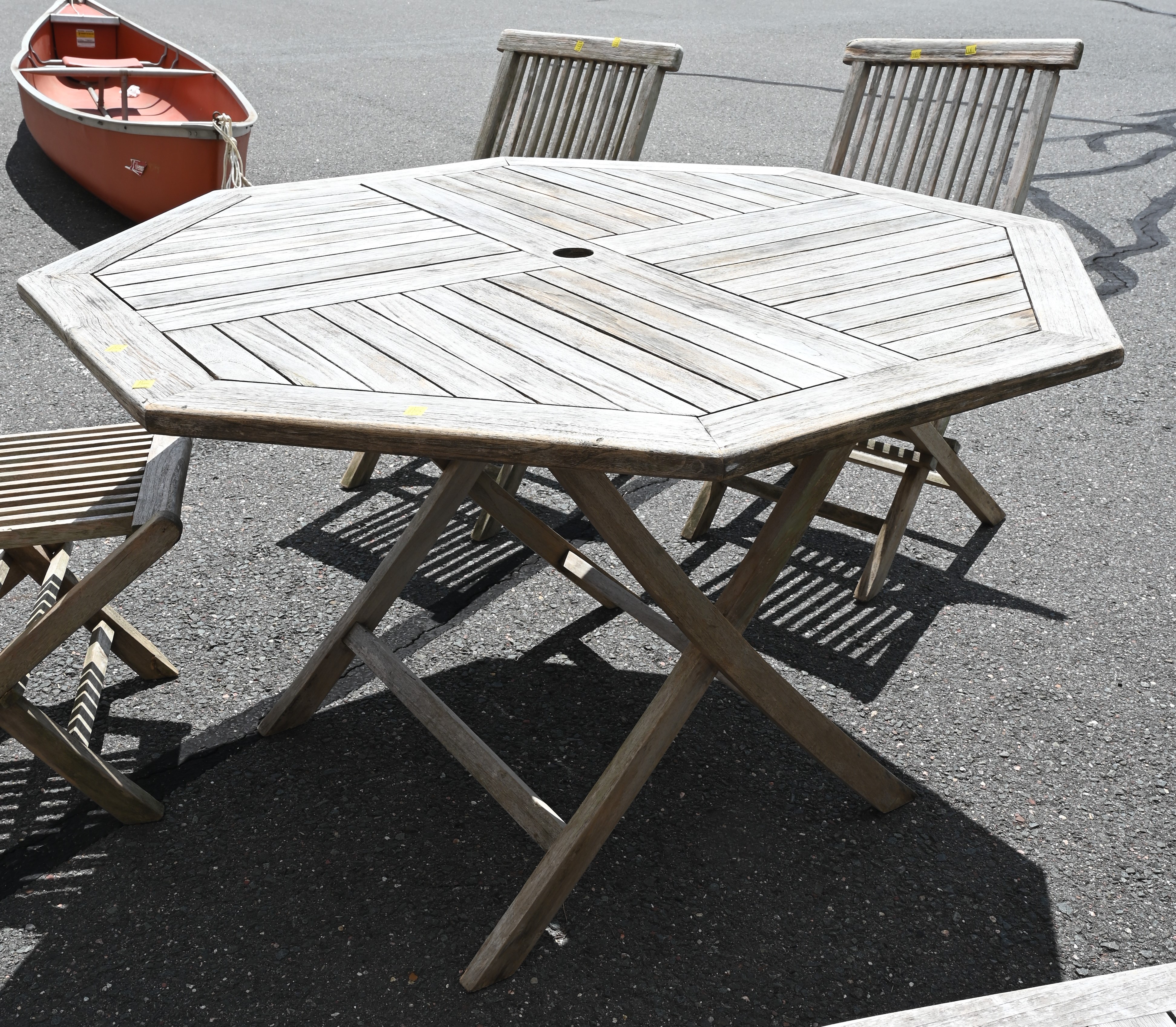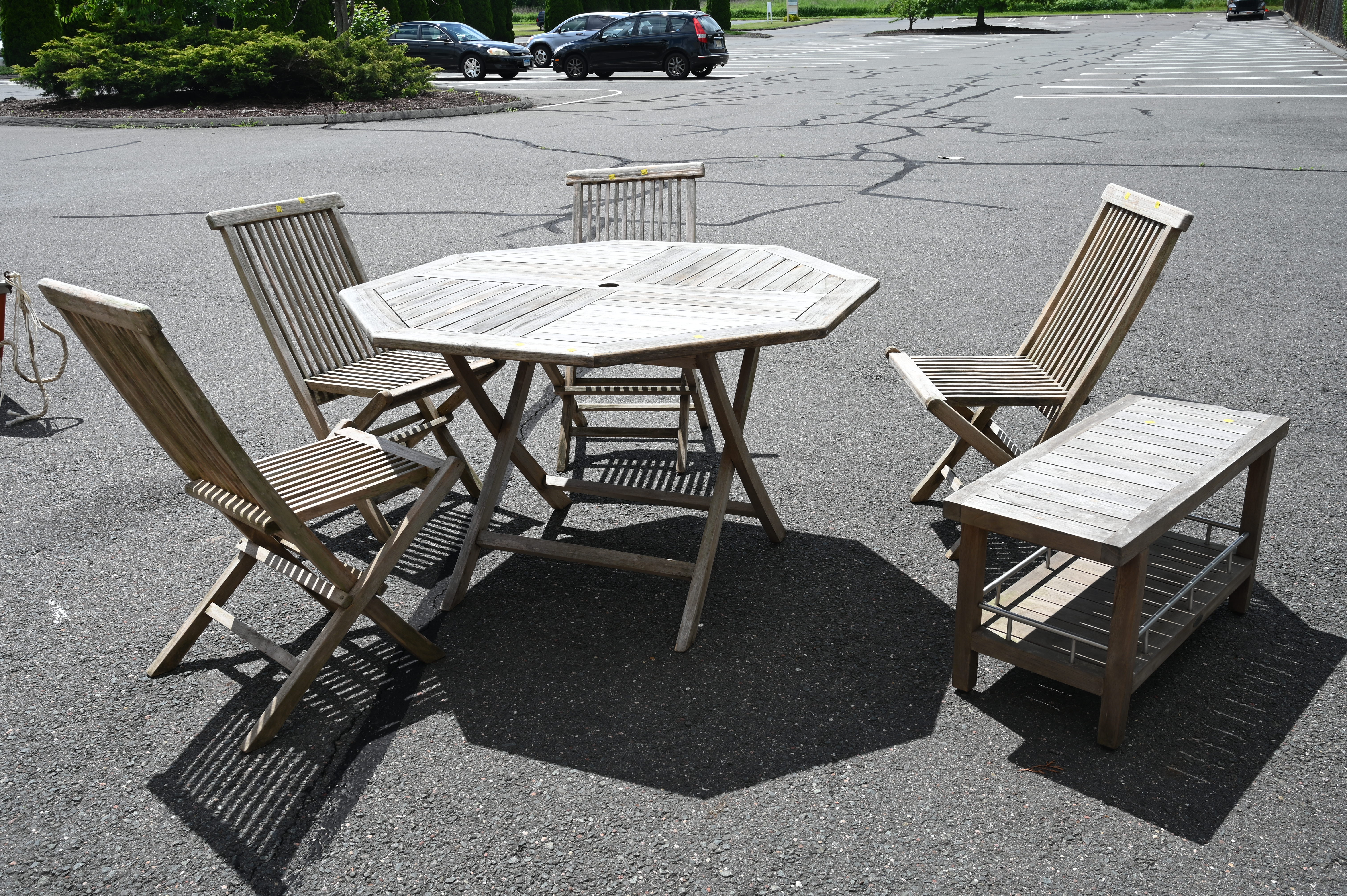 Six Piece Teak Outdoor Patio Set, to include a table with four folding chairs, along with a low table, height 30 inches, diameter 47 inches.