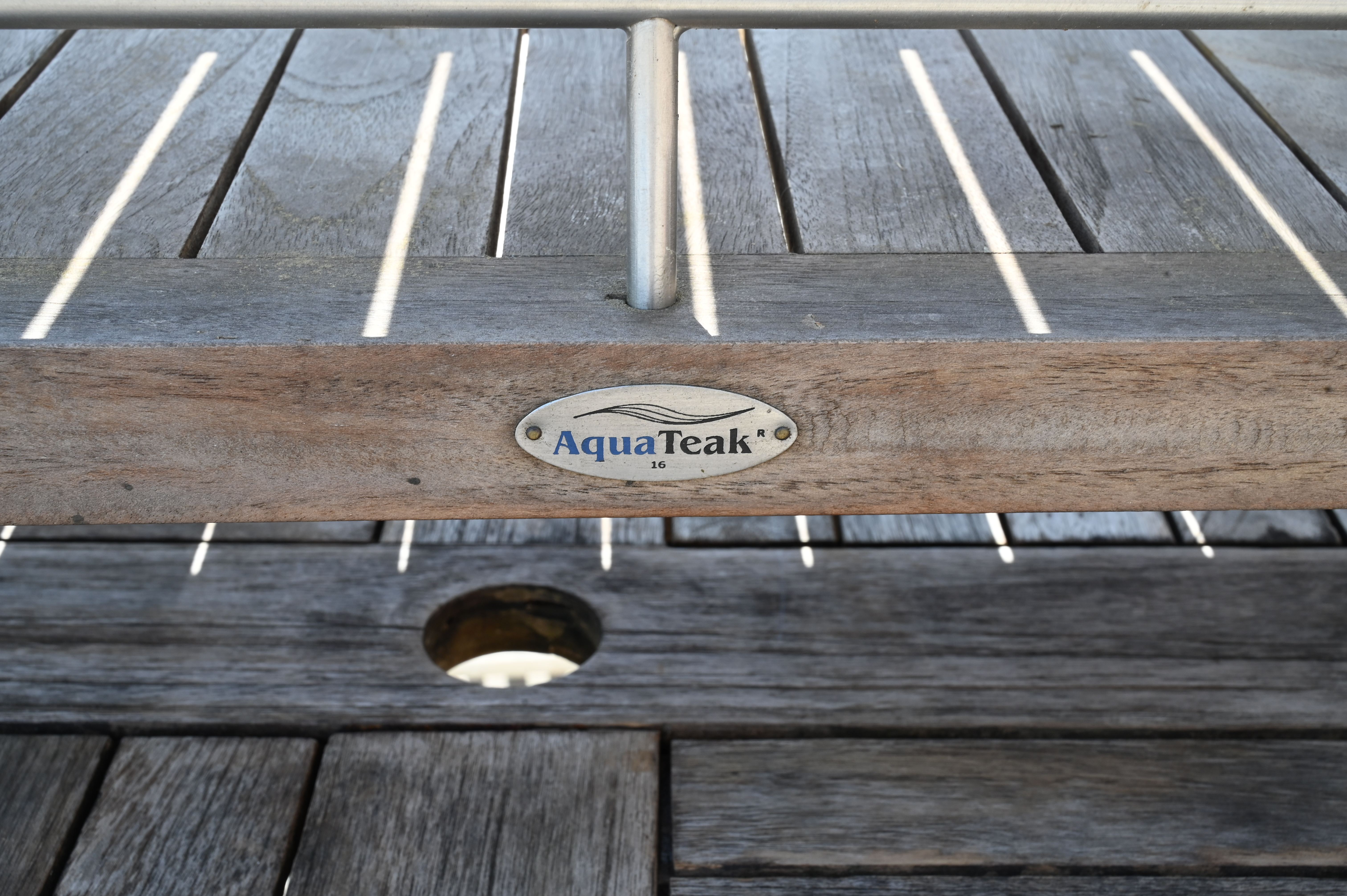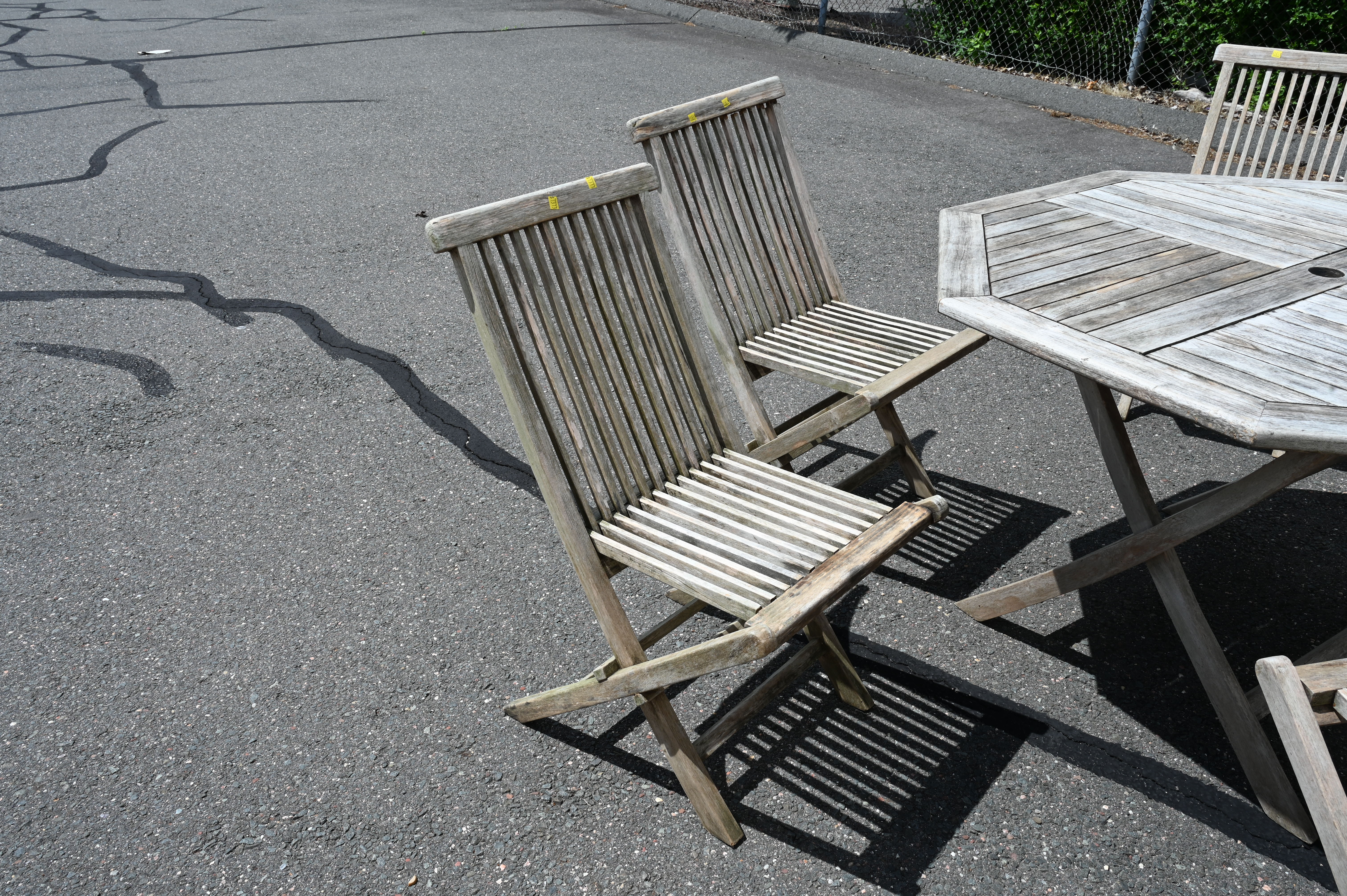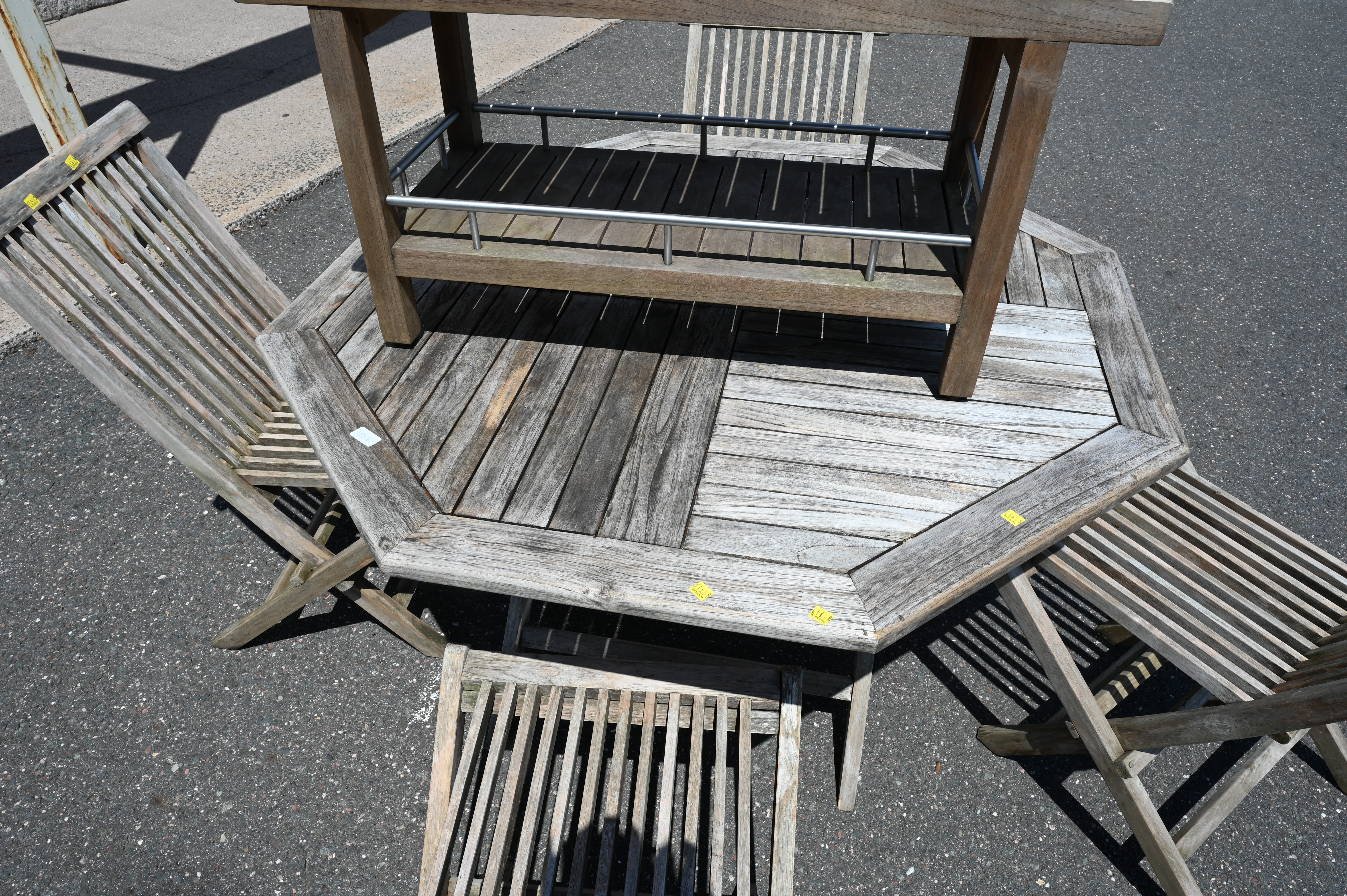 Six Piece Teak Outdoor Patio Set, to include a table with four folding chairs, along with a low table, height 30 inches, diameter 47 inches.
