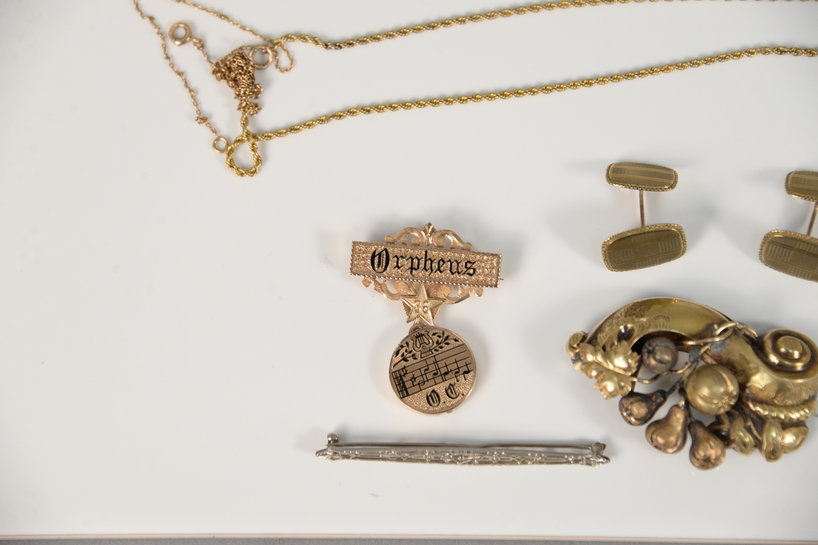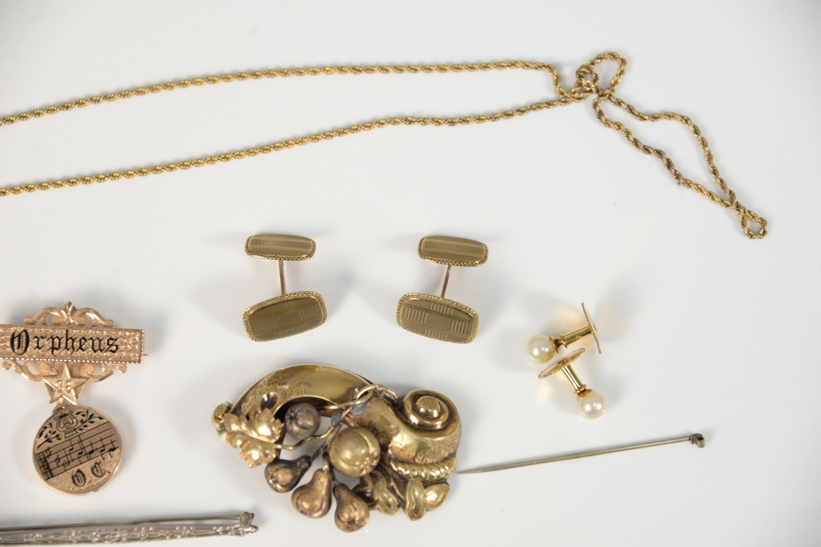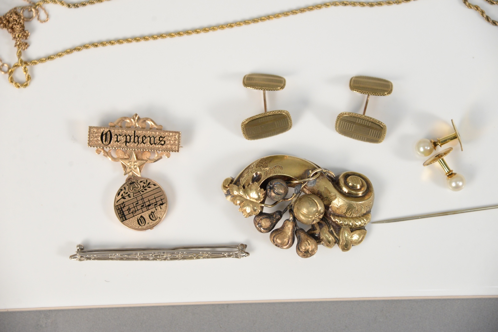 Lot 198: 10K gold lot, two Victorian pins, as is, one chain, bow pin along with two pairs of gold cufflinks, 30 gr. Provenance: Estate of Dr….