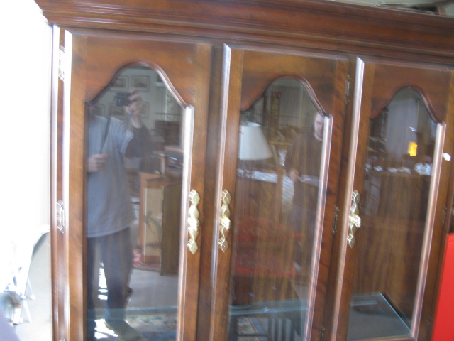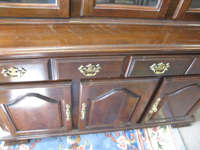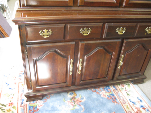 Cherry two part breakfront with glass shelves.