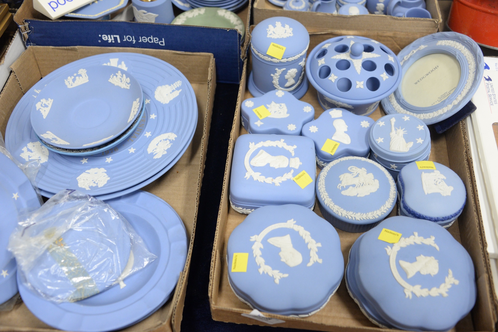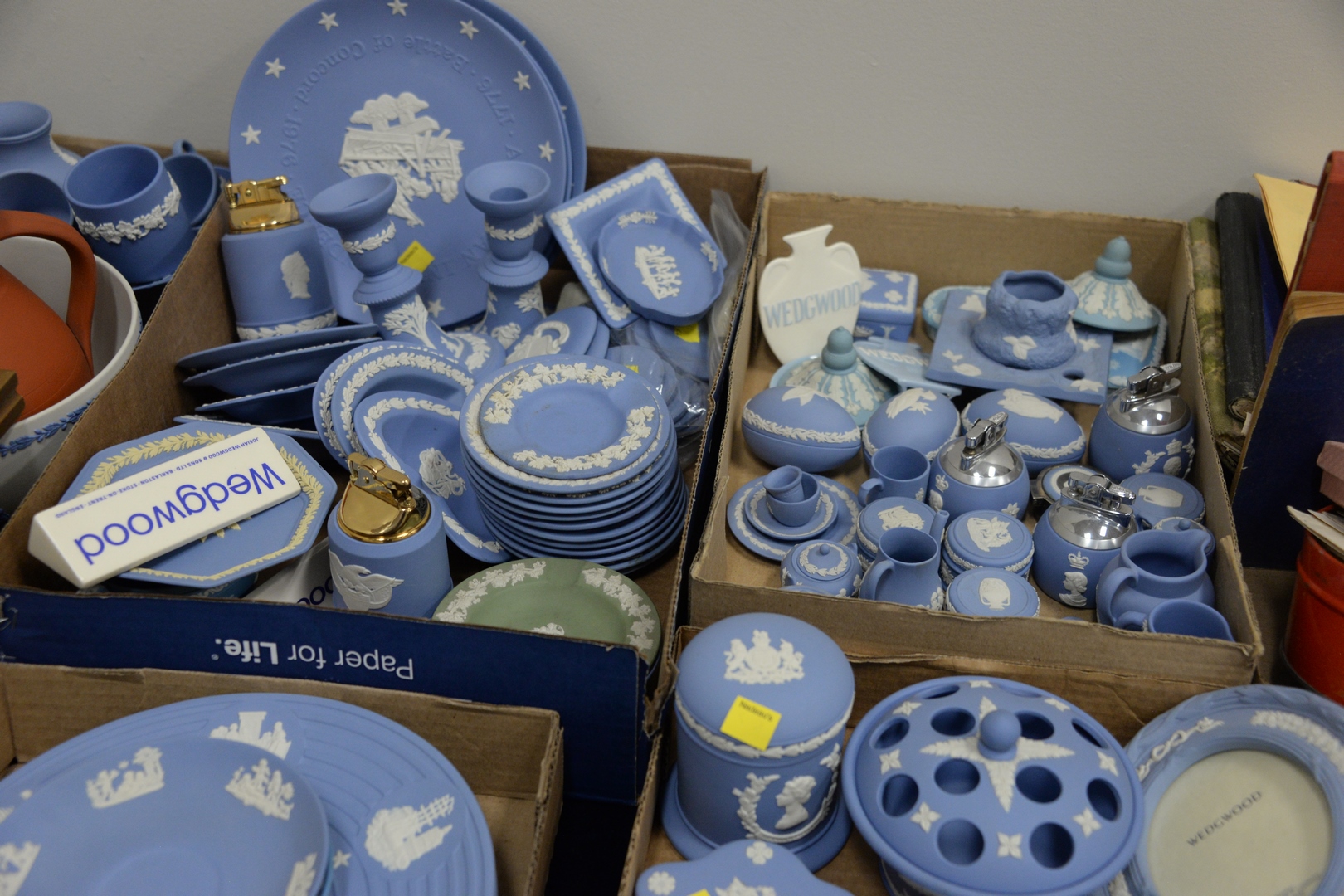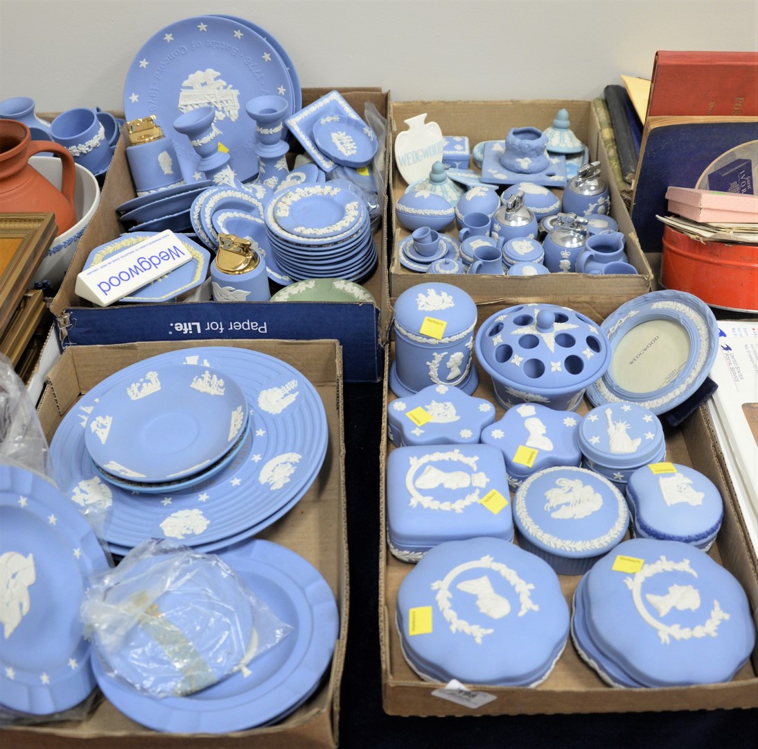 Lot 198: Four Tray Lots of Wedgwood Jasperware, to include cups, saucers, plates, covered boxes, candlesticks, etc., plate diameter 8 1/4 inches. Provenance: Estate of James Wadhams.