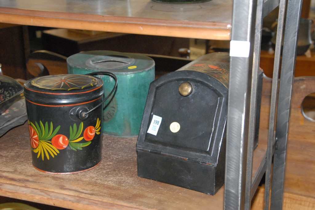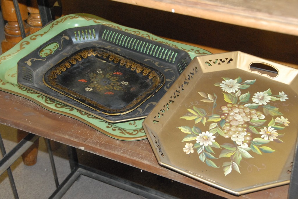 Fourteen piece lot of Toleware trays and containers plus primitive wooden items.