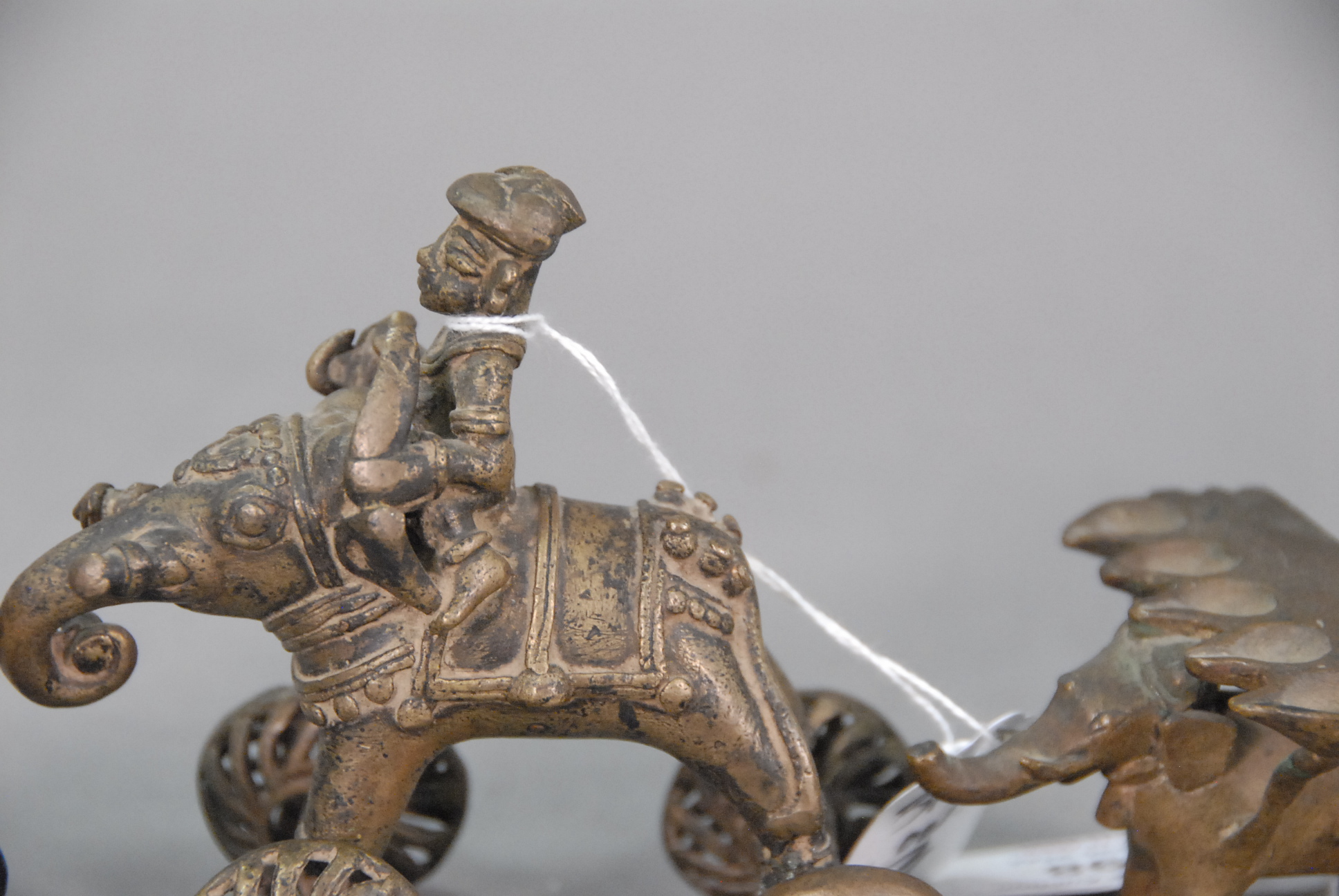 Group of three Indian miniature elephant bronzes: one of the god Ganesh, and one wheeled.