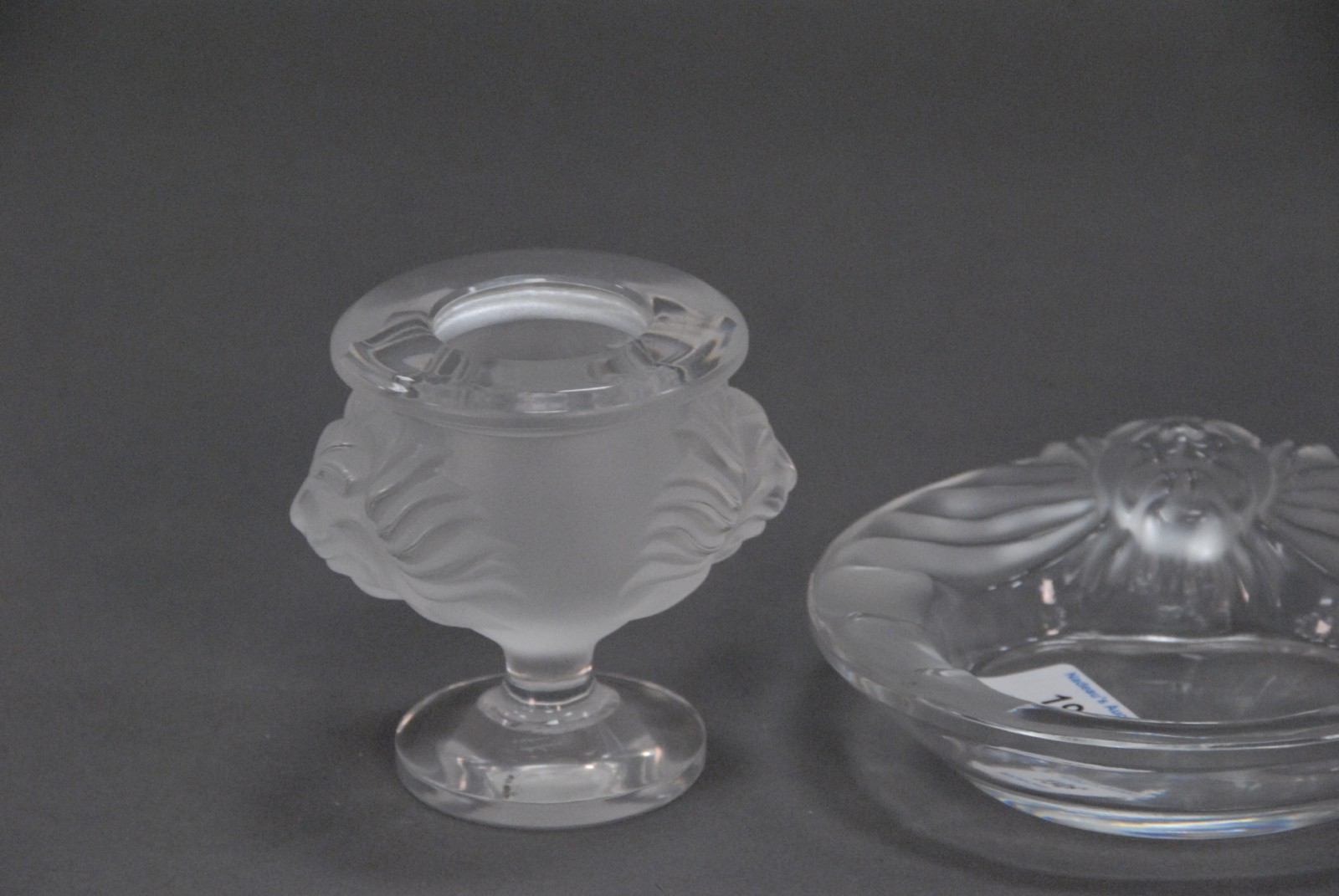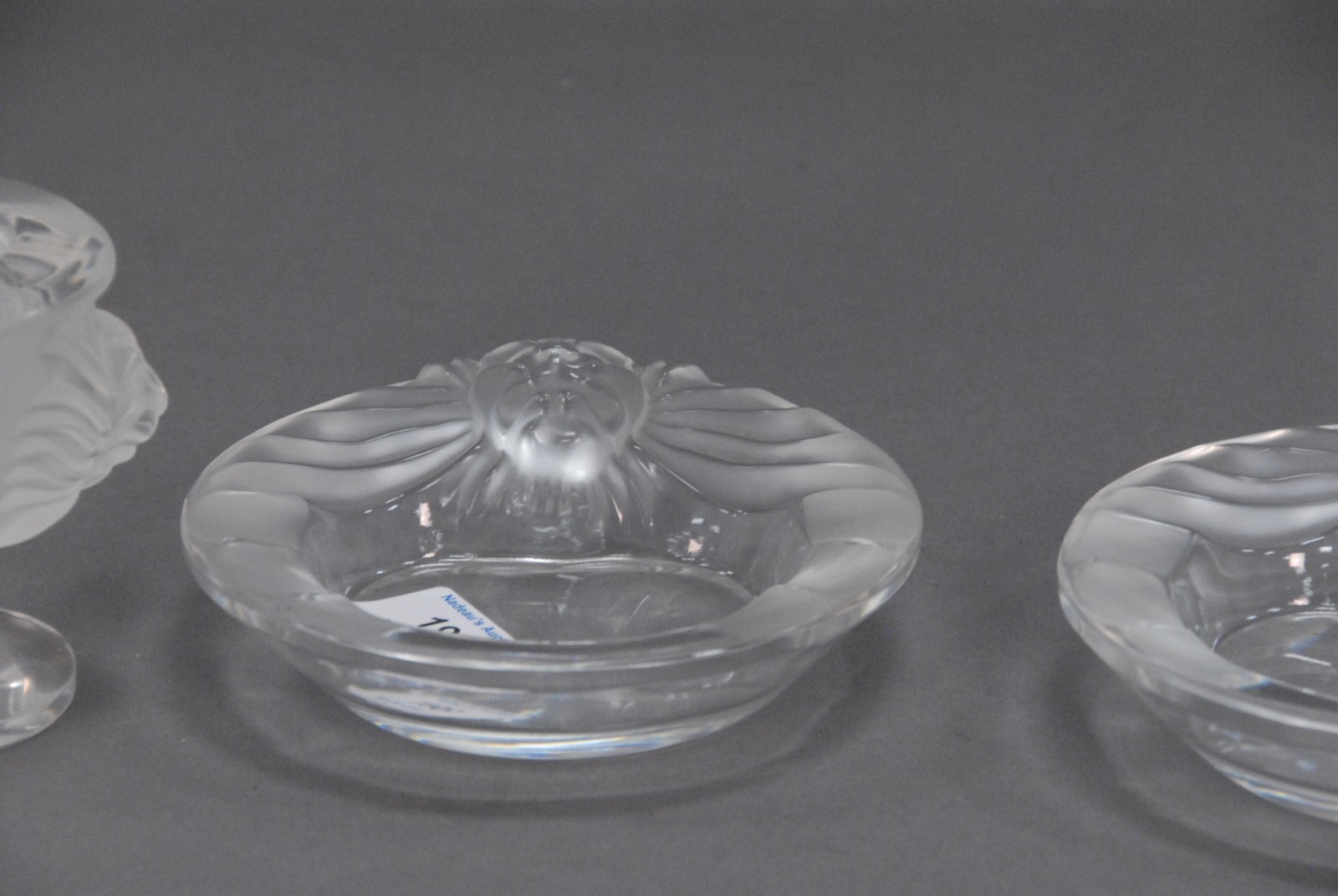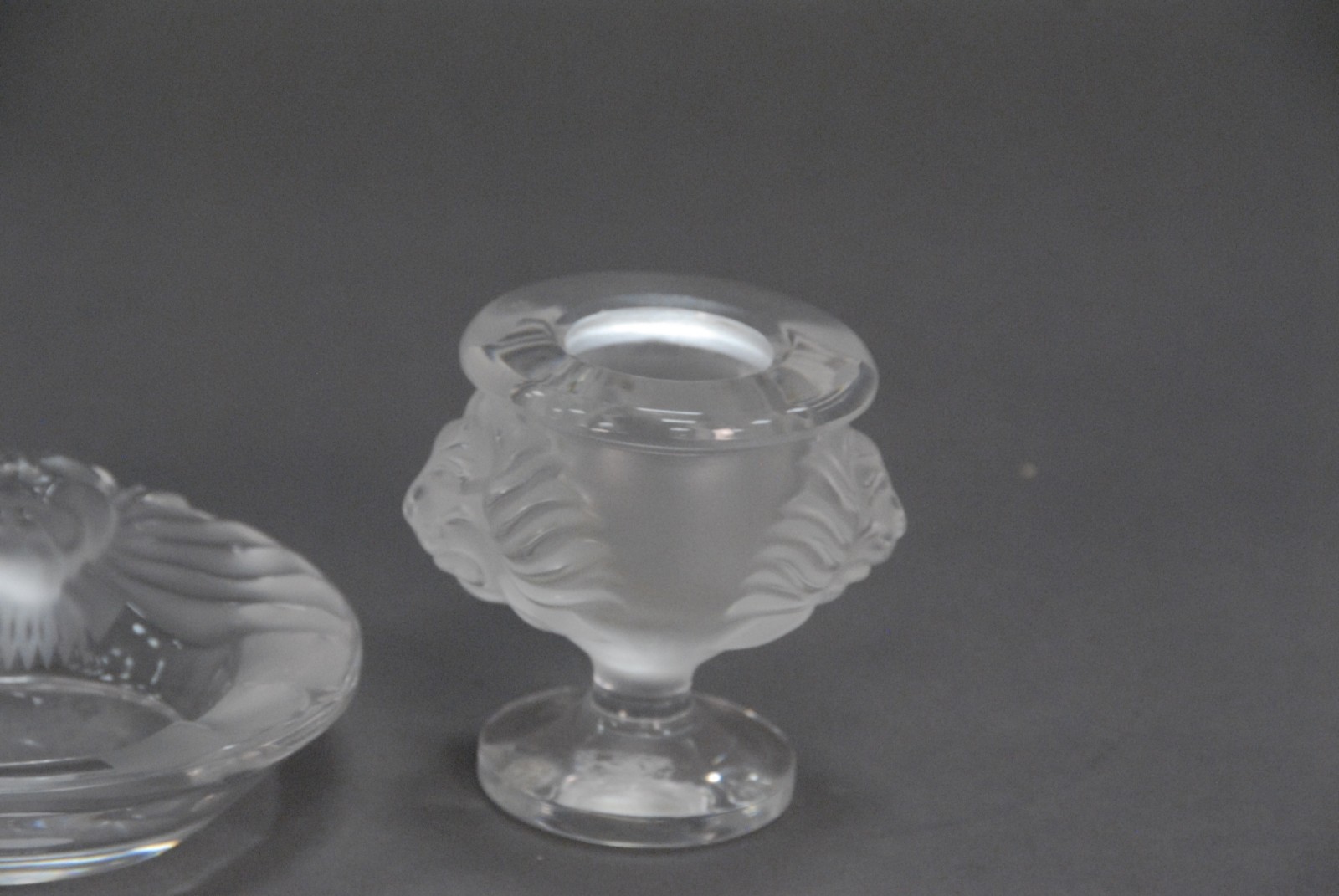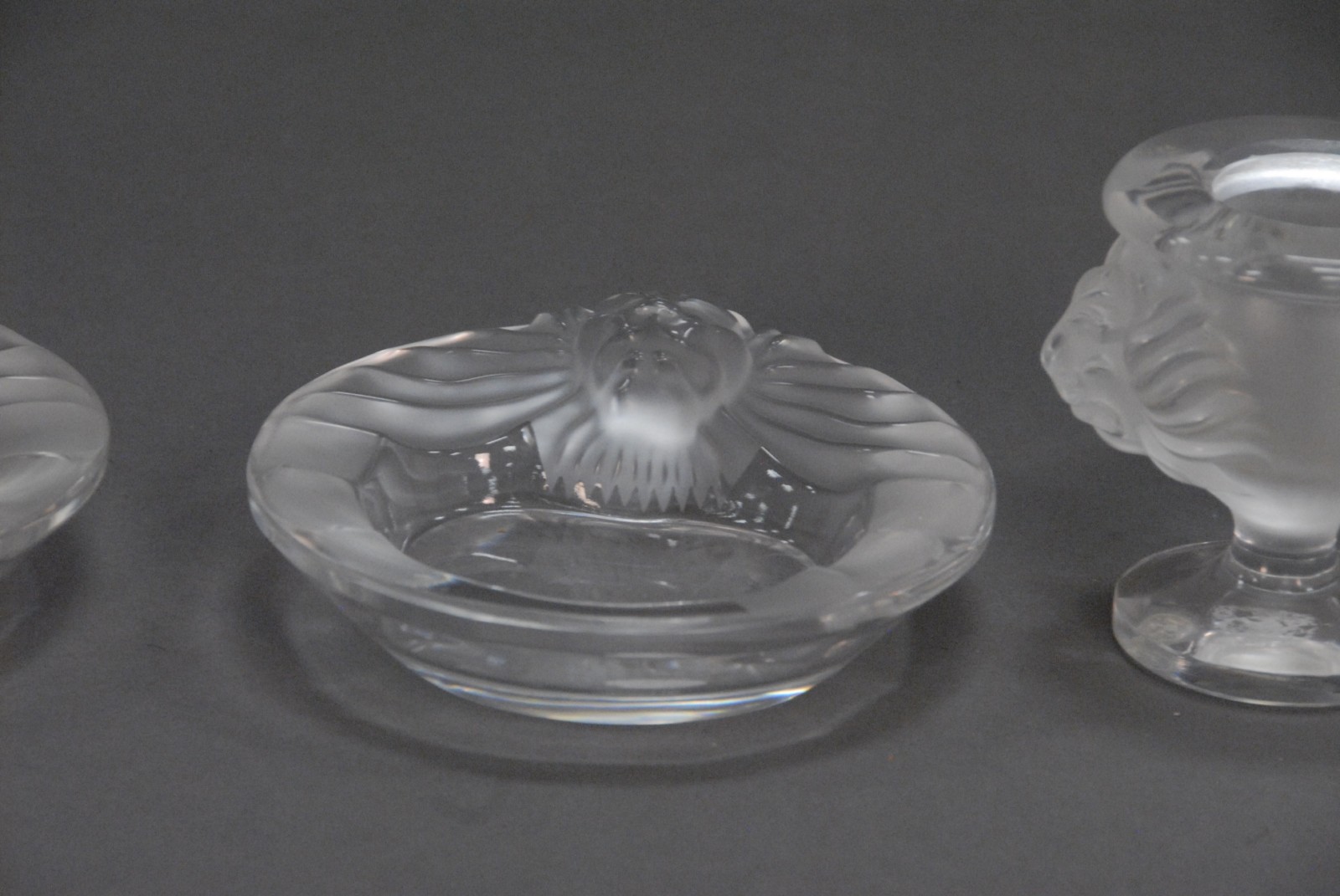 Lalique four piece lot to include two cigarette holders and two ashtrays with frosted faces all signed Lalique France in script.