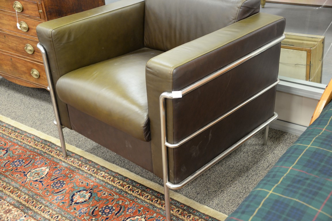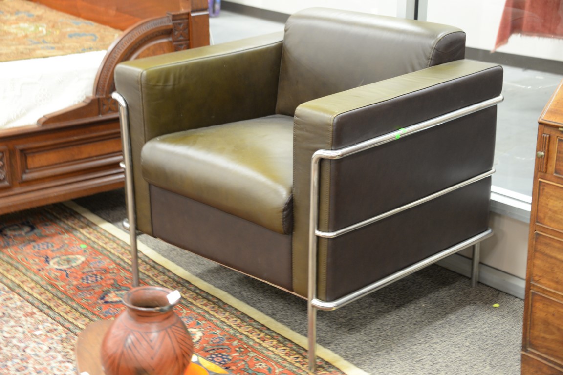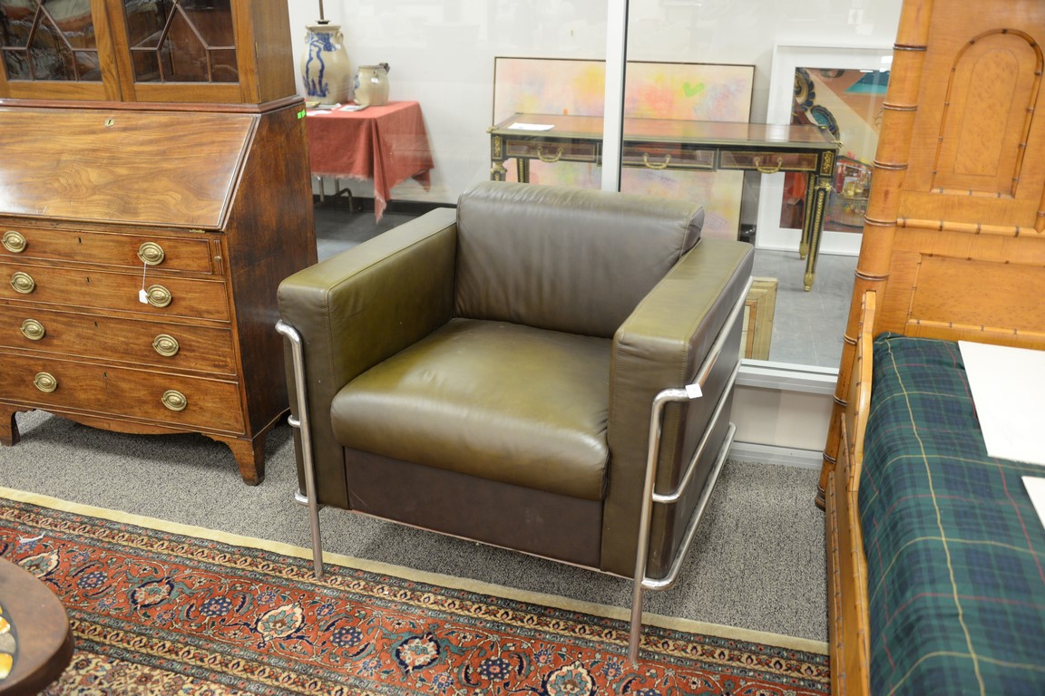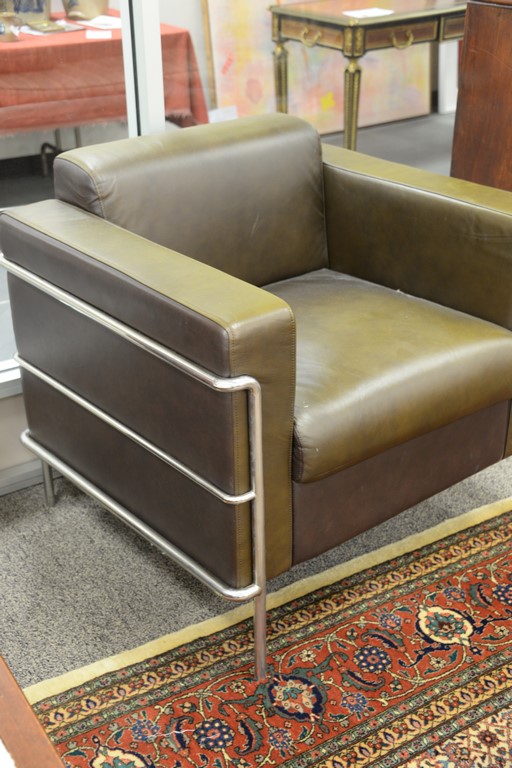 Lot 198: Large scale pair of Le Corbusier leather chairs. height 36 1/2 inches, seat height 23 inches