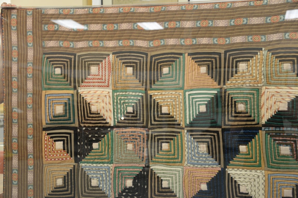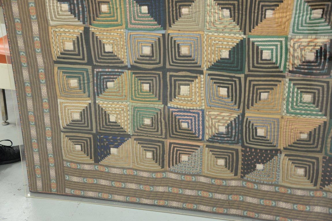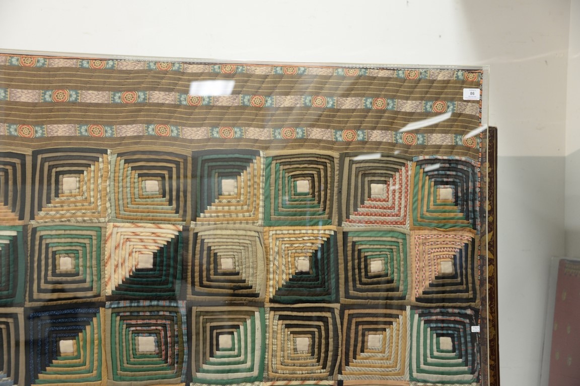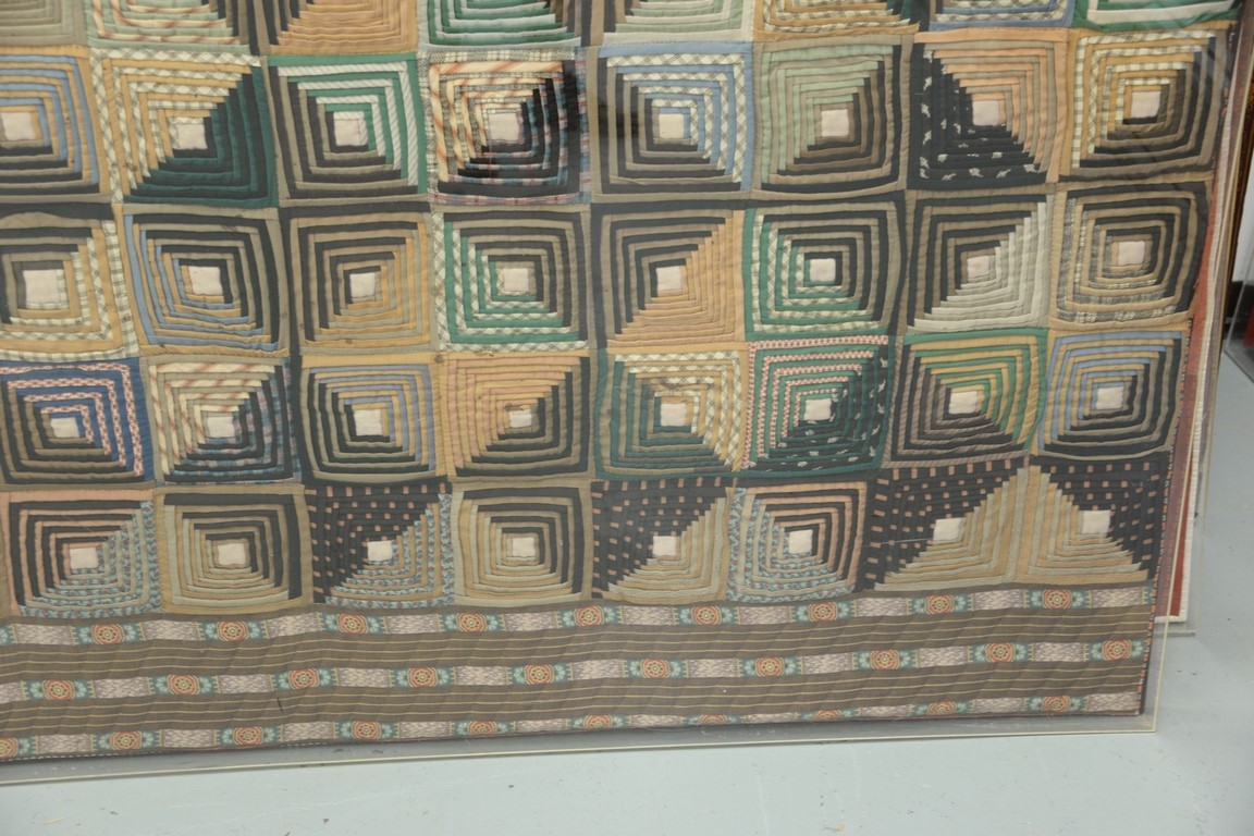 Lot 198: Log cabin style quilt, squares with borders, stretched and in plexiglass. 76 x 80 Provenance: Property from Credit Suisse’s Americ…
