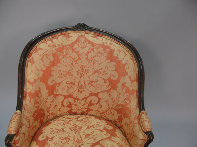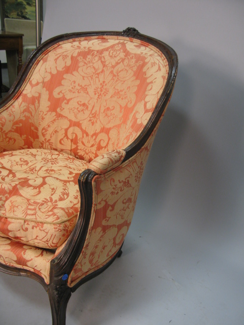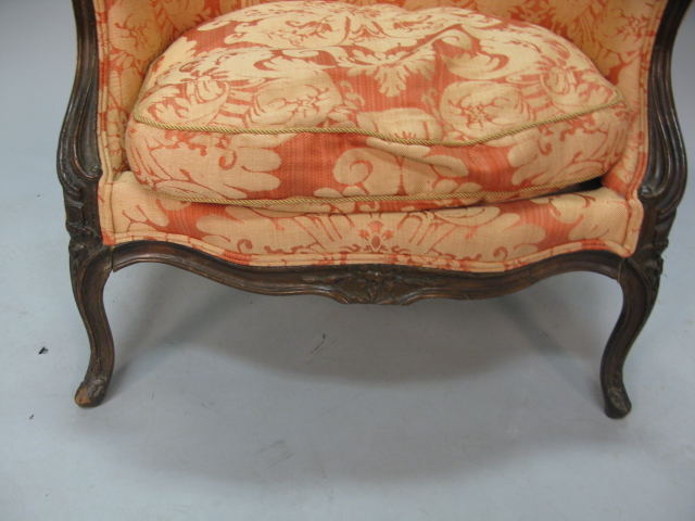 Louis XV Bergere with upholstered barrel back on cabriole legs, 18th century some repairs.