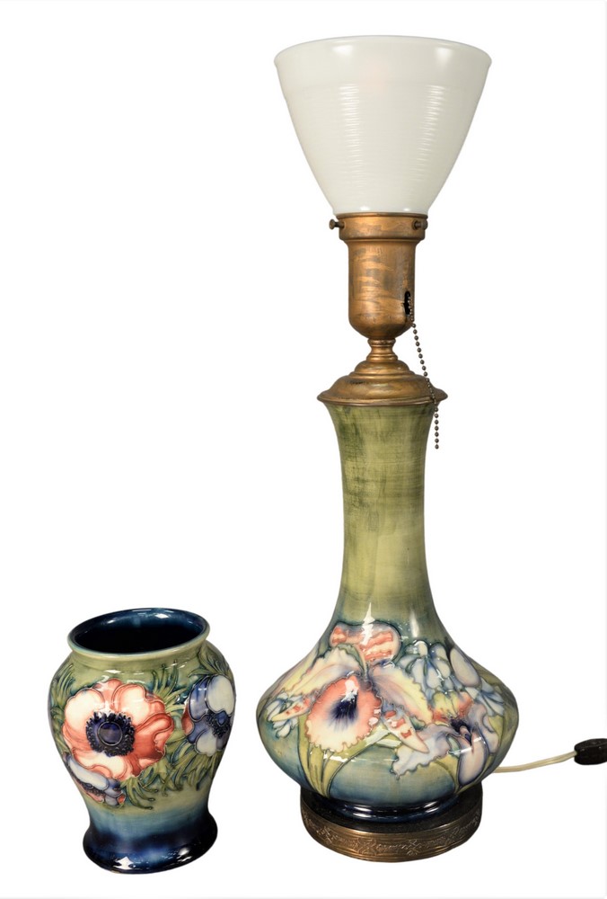 Lot 198: Moorcroft Two Piece Lot, to include a small vase along with a vase turned into a table lamp, height 6 3/4 inches and 22 1/2 inches.