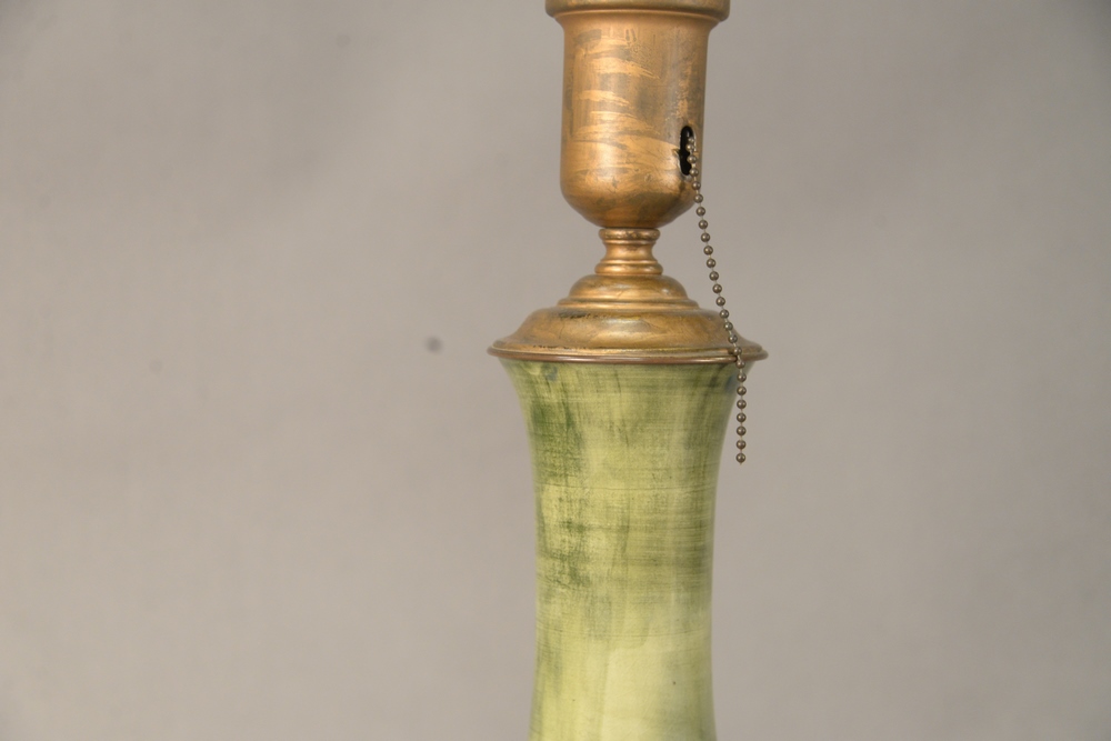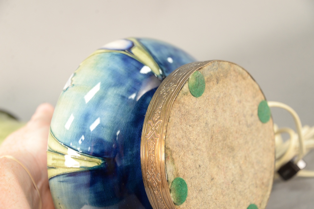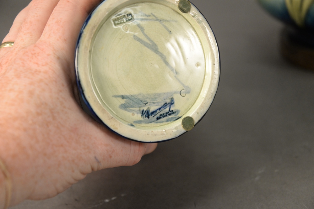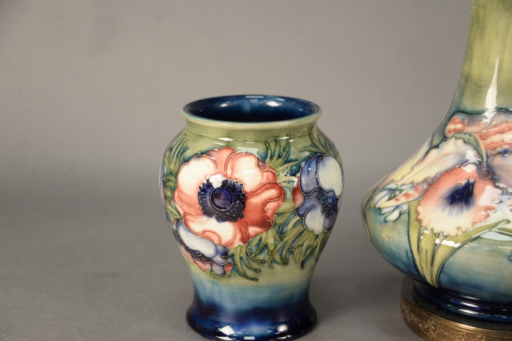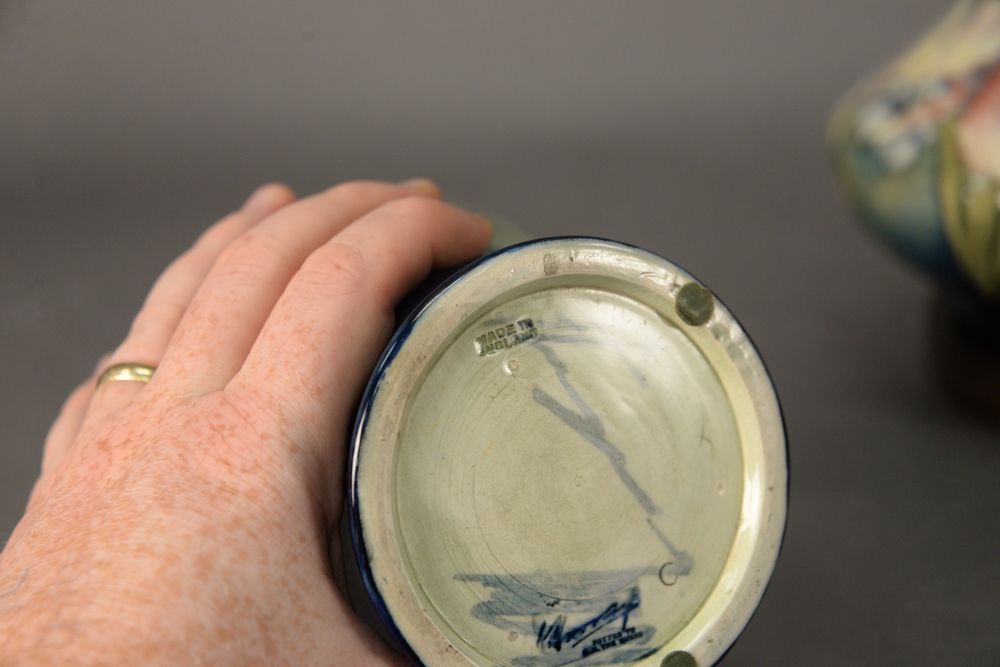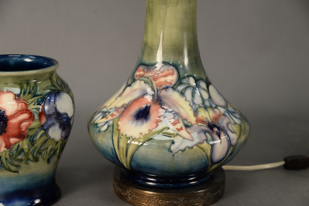 Lot 198: Moorcroft Two Piece Lot, to include a small vase along with a vase turned into a table lamp, height 6 3/4 inches and 22 1/2 inches.
