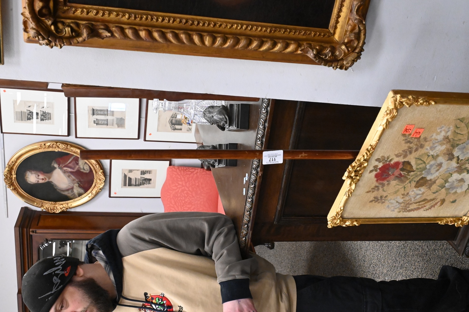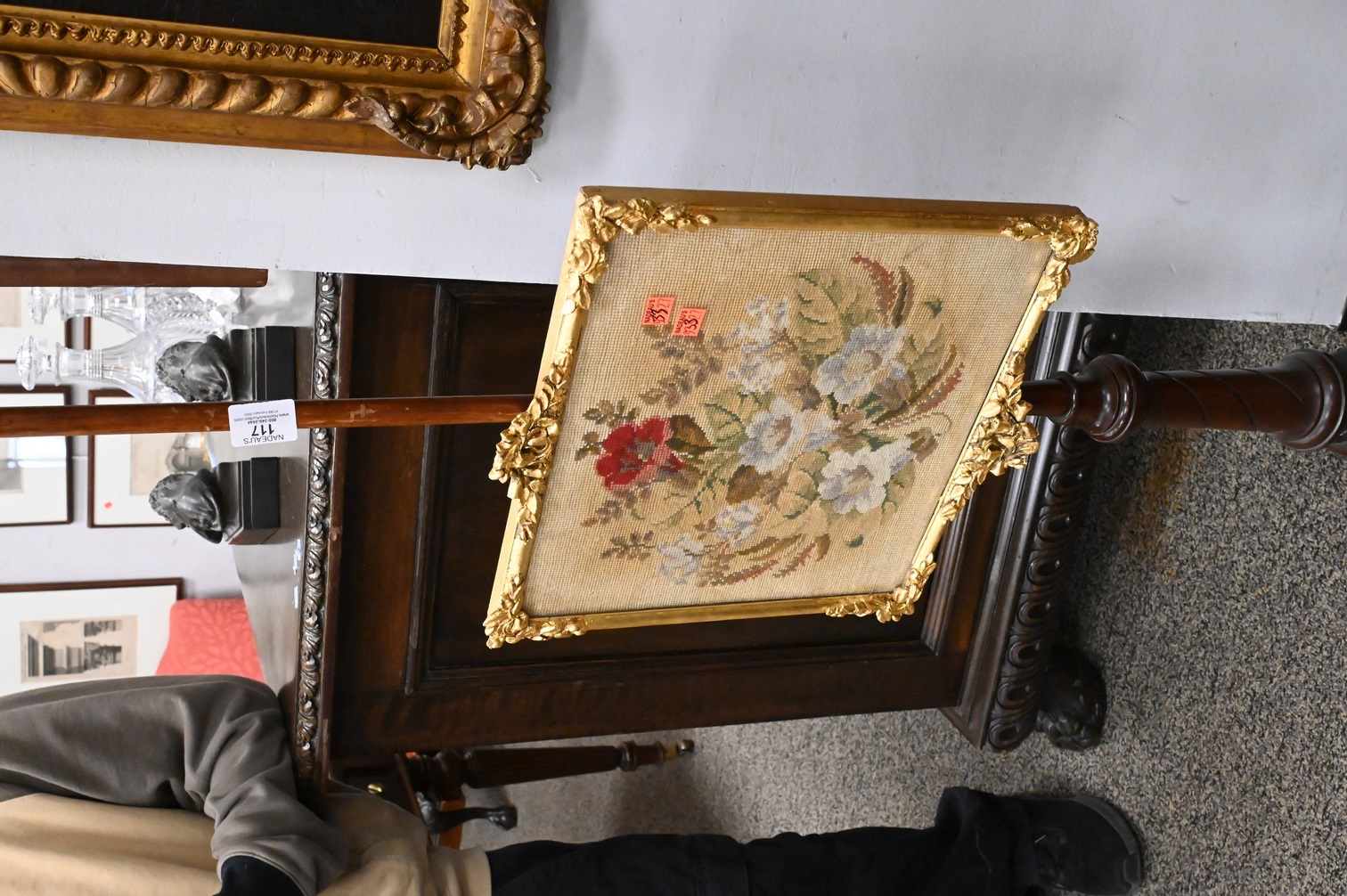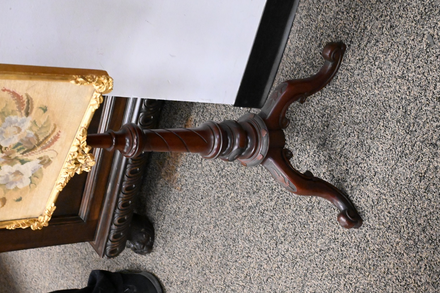 having needlepoint depicting floral scene encased in gilt frame set on carved mahogany tripod base