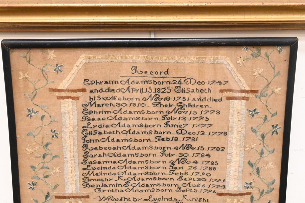 Needlework Sampler, Adams Family Record, 1747 – 1796, wrought by Lucinda Knight, Hancock, New Hampshire, age 12 years, 19th century, 15 1/4″ x 19 3/4″. Provenance: An estate from Redding, CT.