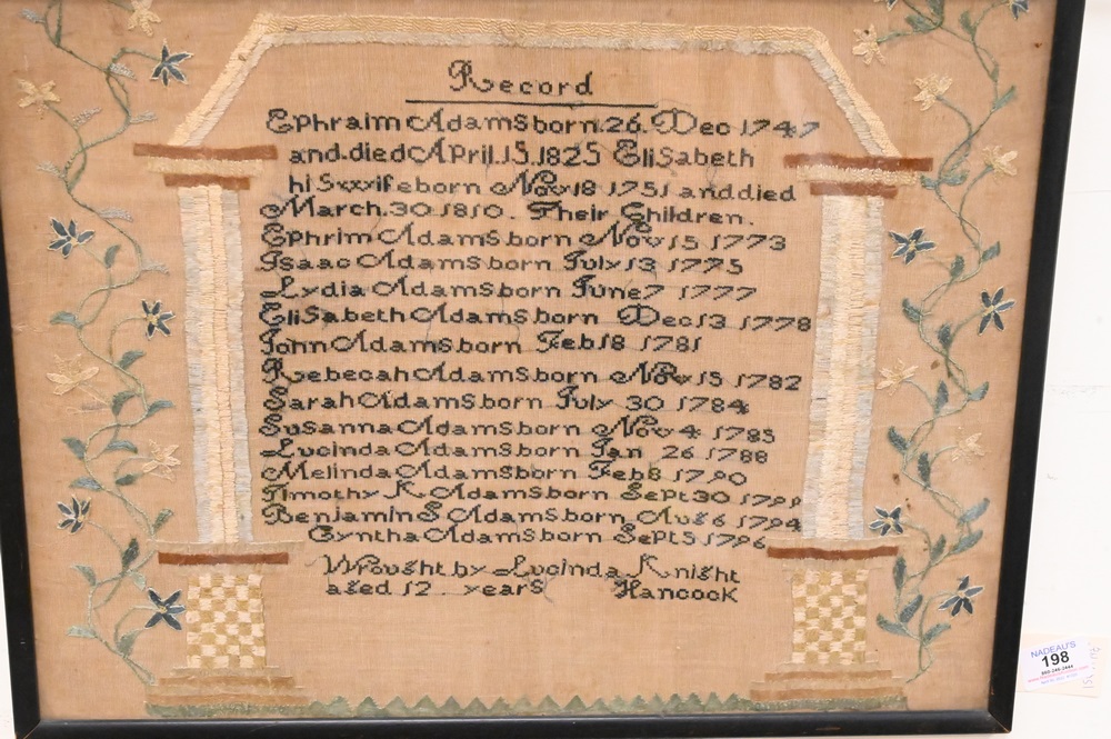 Lot 198: Needlework Sampler, Adams Family Record, 1747 – 1796, wrought by Lucinda Knight, Hancock, New Hampshire, age 12 years, 19th century, 15 1/4″ x 19 3/4″. Provenance: An estate from Redding, CT.