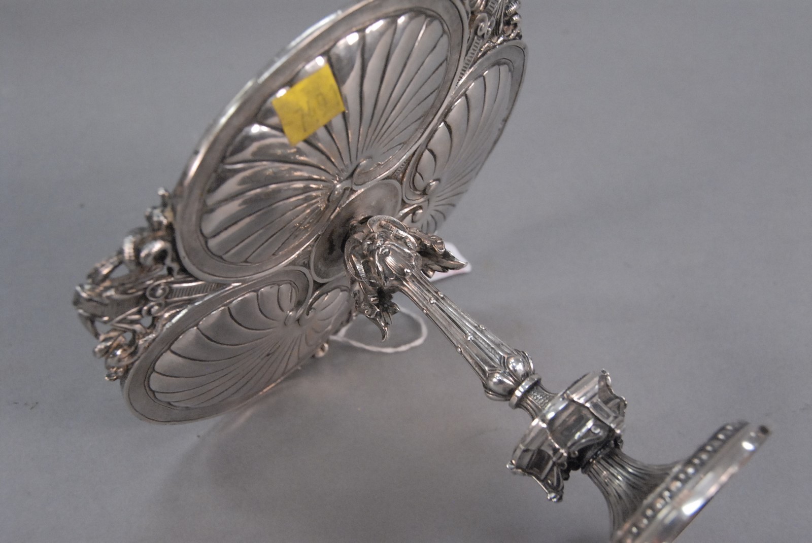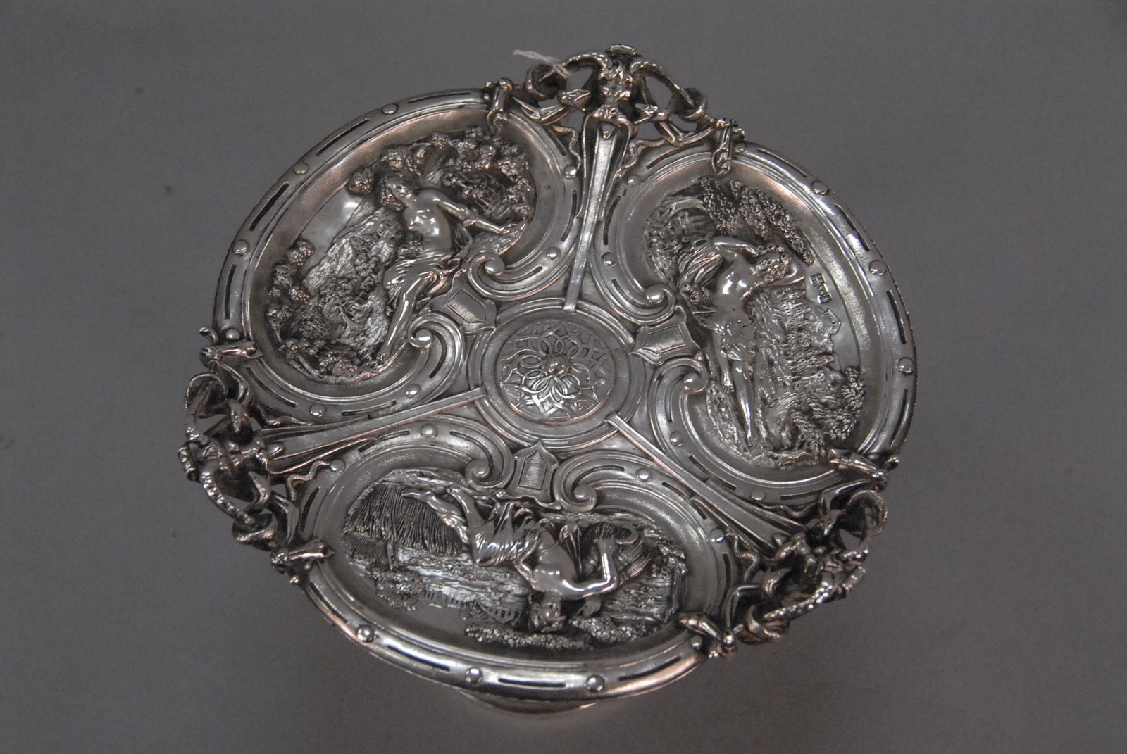 Lot 198: Russian silver tazza marked 84 double eagle AK 1842, detail with women against landscapes, marked in three places. ht. 6 1/2 in. 30.5 t oz.