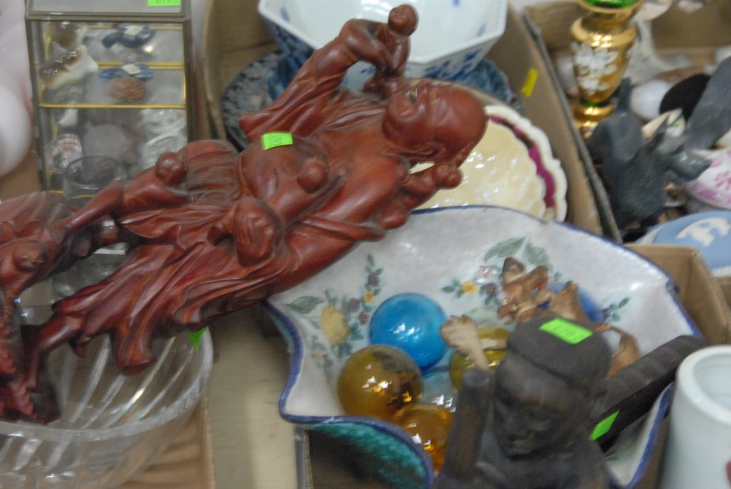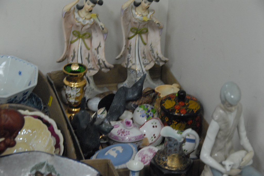 Six box lots of glassware, china, curios, pair of vases, Oriental figure, etc.