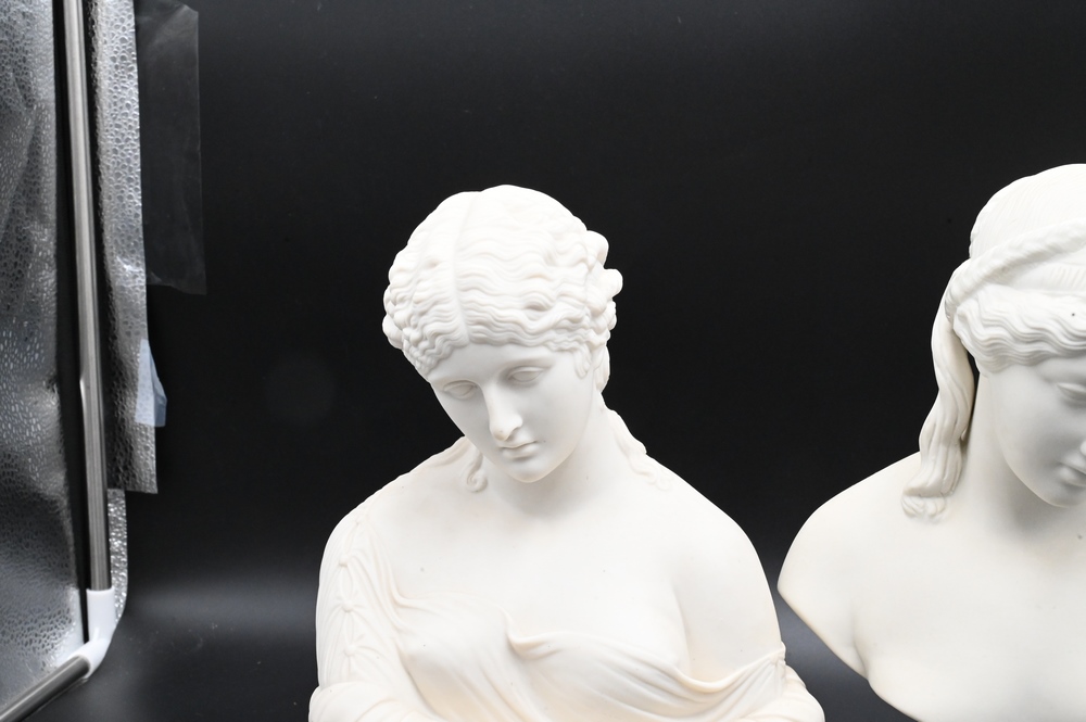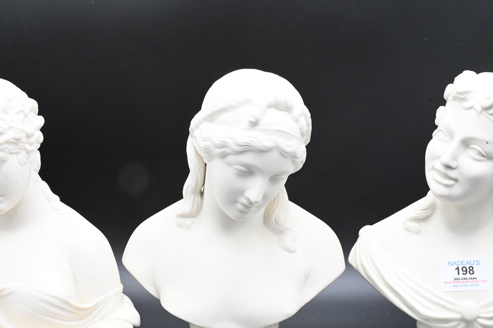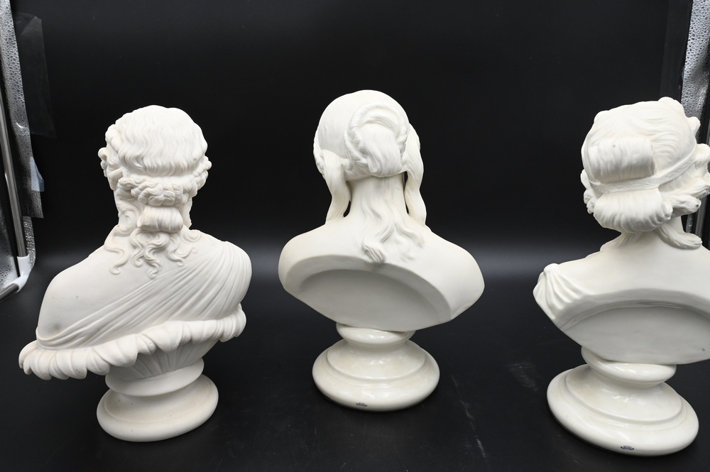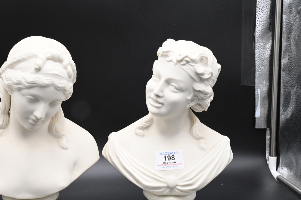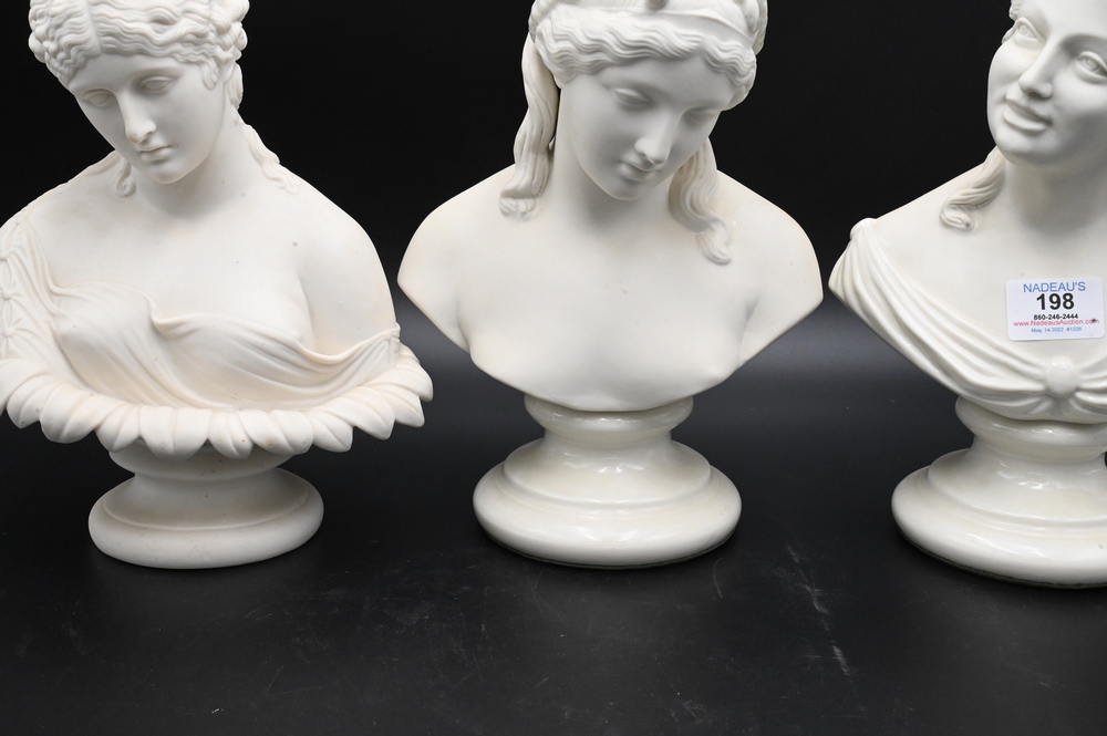 Three Belleek Porcelain Busts, height 10 inches. Provenance: Collections of Norma Reilly, New Jersey.