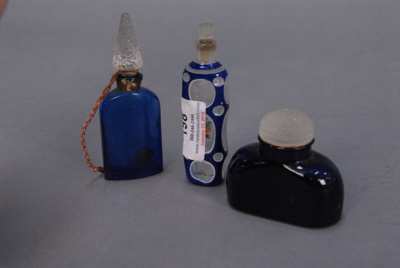 Lot 198: Three piece lot to include blue and white cut to clear perfume, cobalt blue Bourjois perfume and powder lot. hts. 3 3/4in., 4in. & 2…