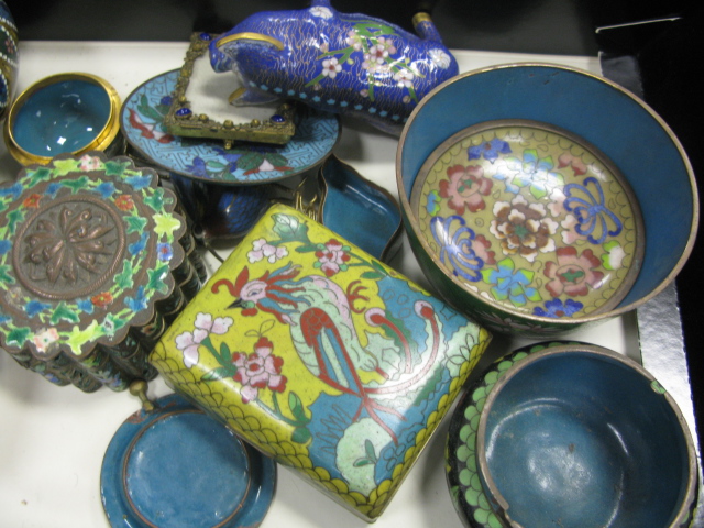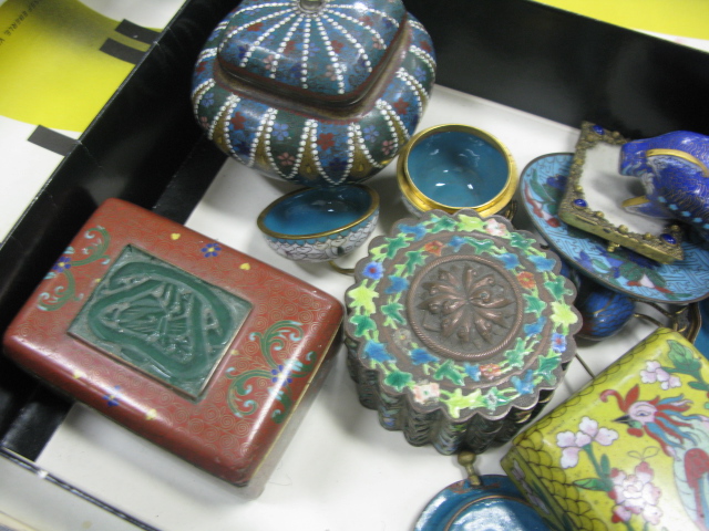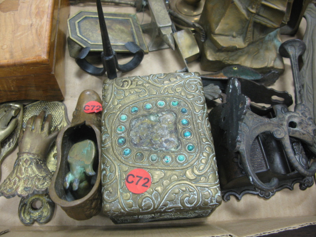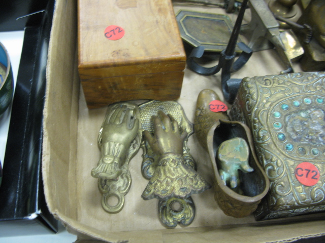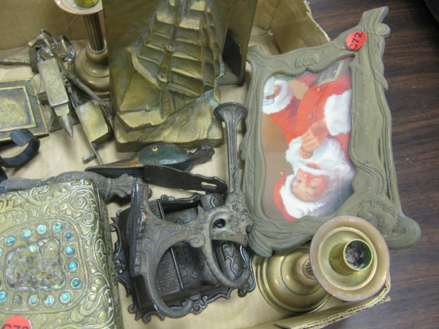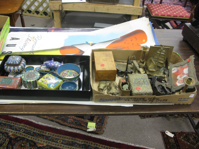 Two box lot including curios, door knockers, small music box, crimpers, brass candlesticks, pair of bookends, picture frame, metal items of various sorts, cat figure, small box, box of several cloisonn pieces, etc.