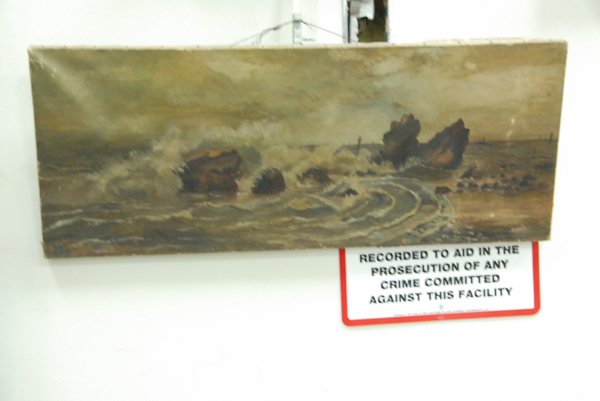 Two oil paintings one with a seascape and one with a mountain and lake scene.