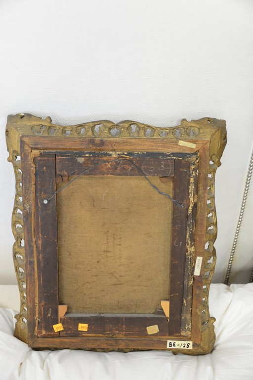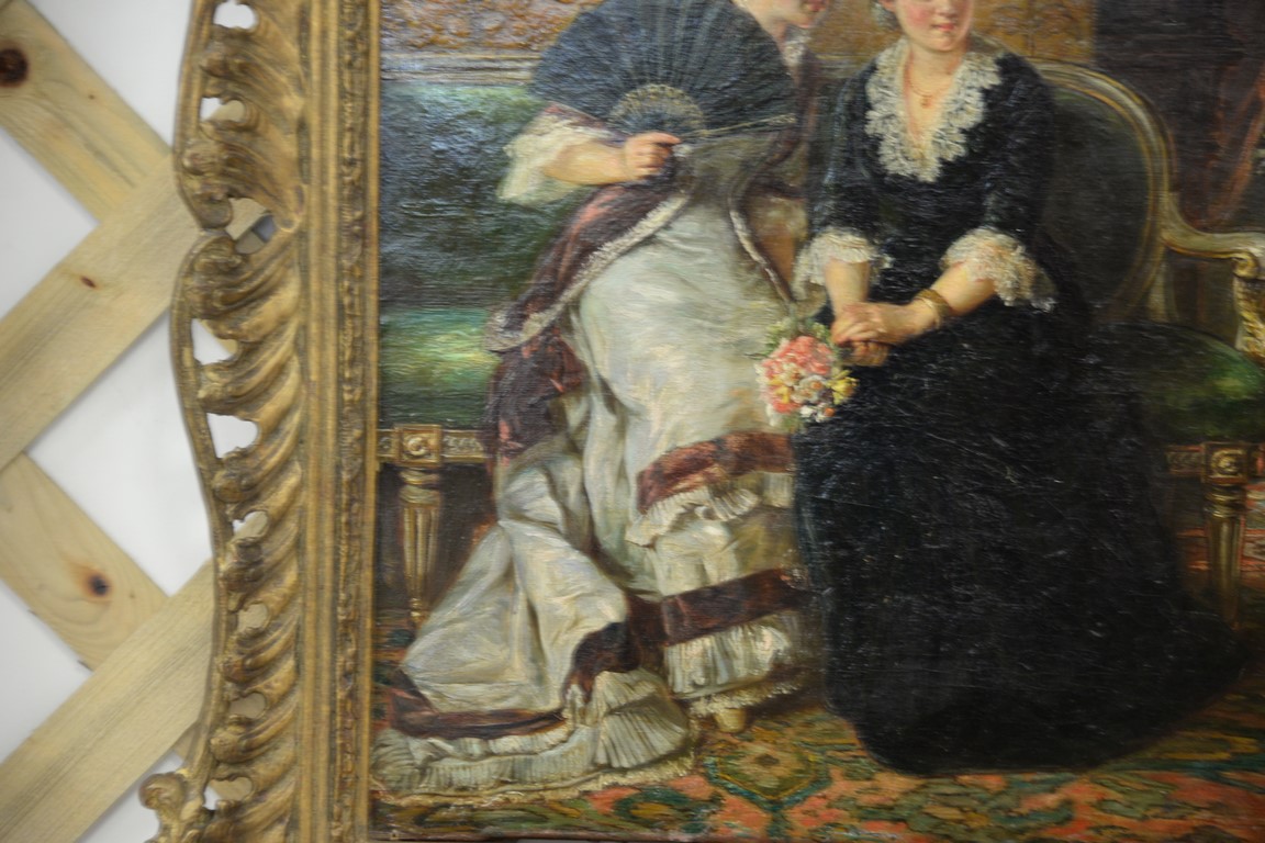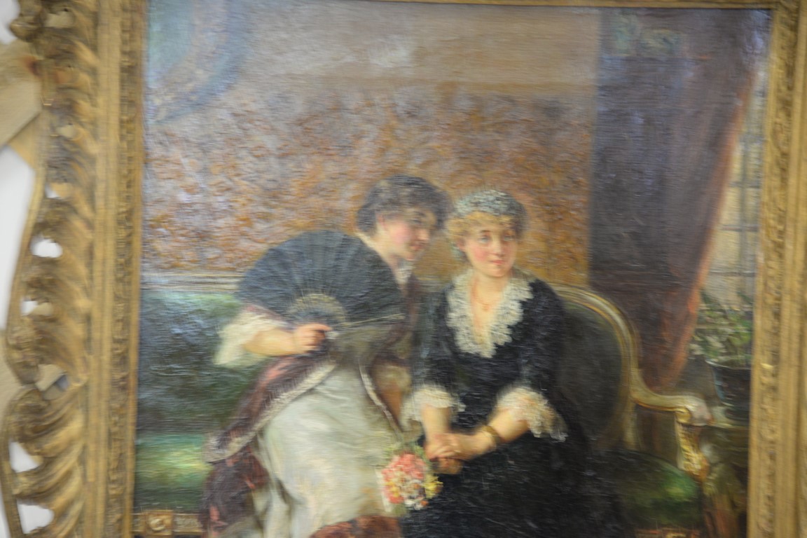 Victorian interior oil on canvas painting of two women gossiping, unsigned, 16 1/2 x 13 1/2