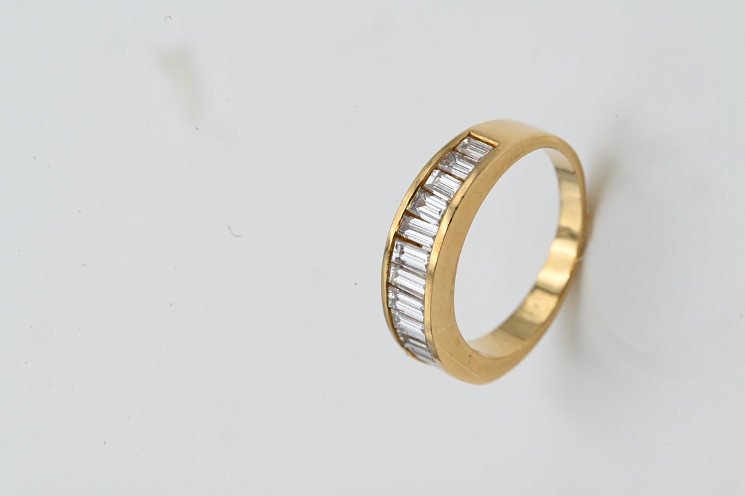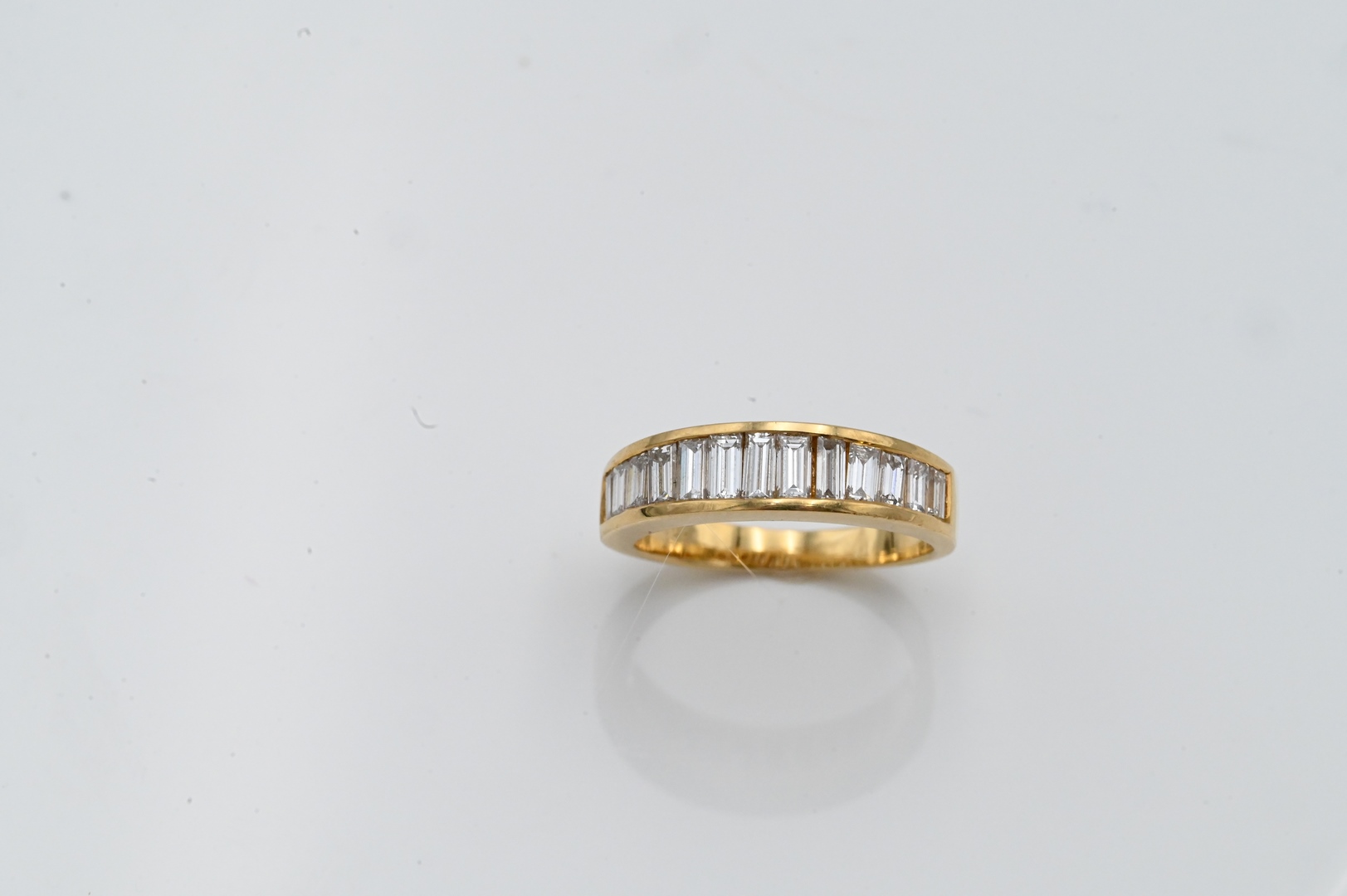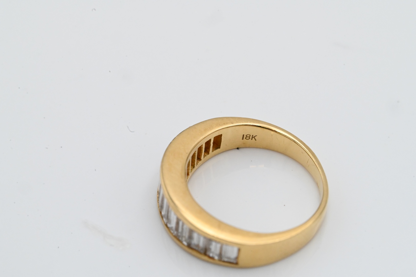18 Karat Yellow Gold Ring channel set with 13 emerald cut diamonds size 4 Provenance: From Collection in Irvington, New York Condition: good condition