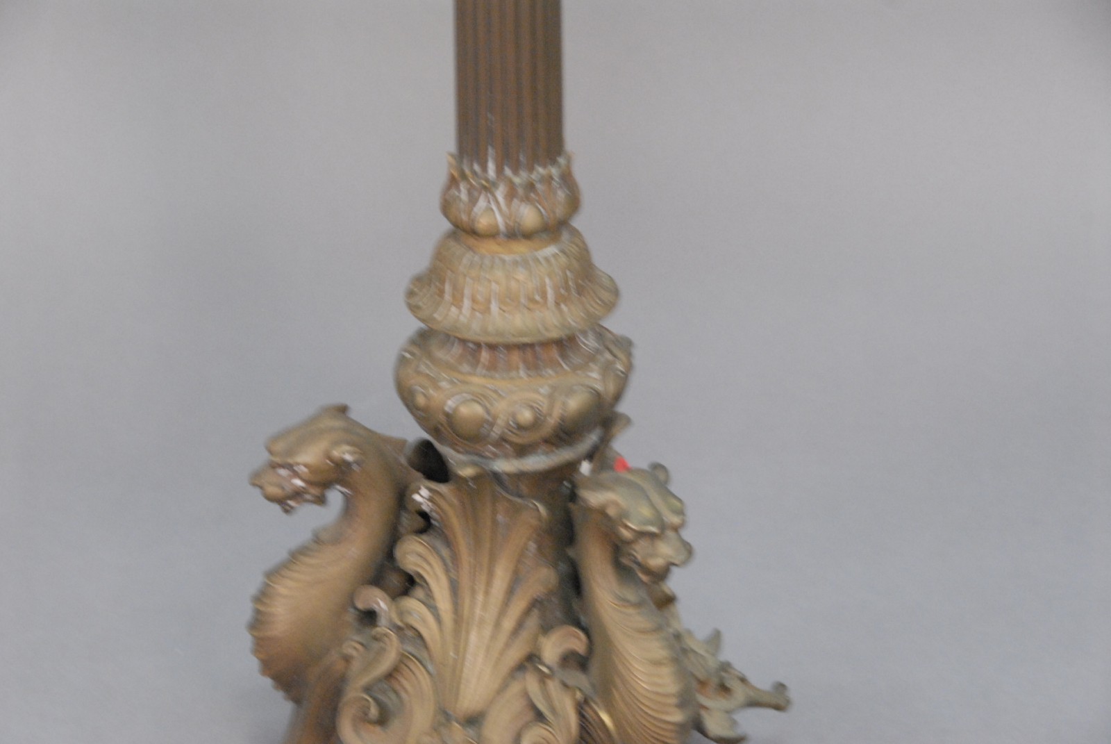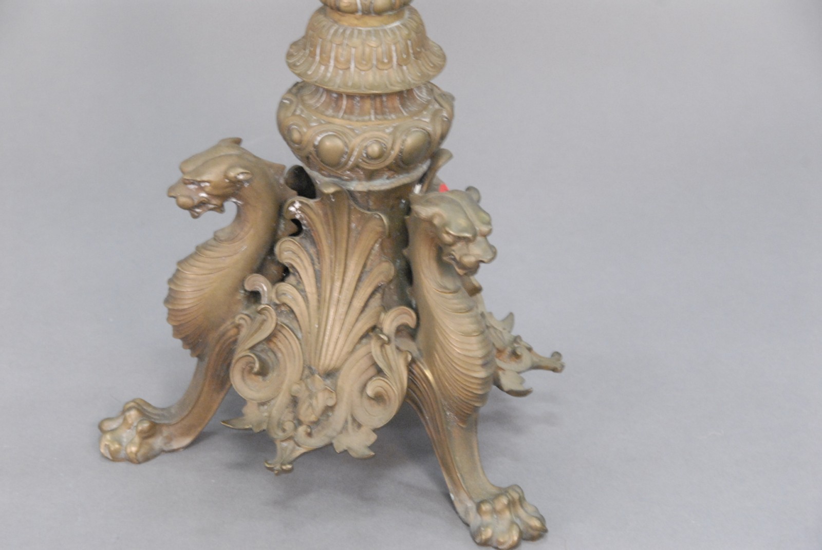 Bronze eight light candelabra with three griffin base and claw feet, center candleholder a replacement.