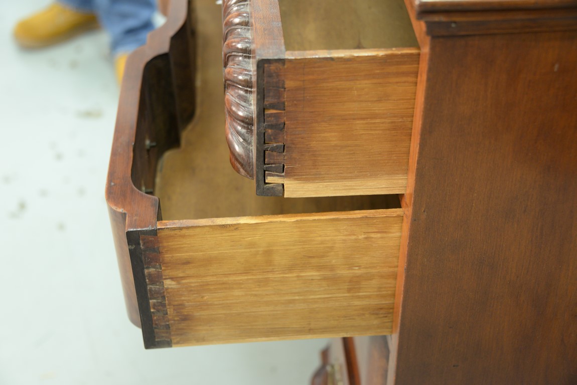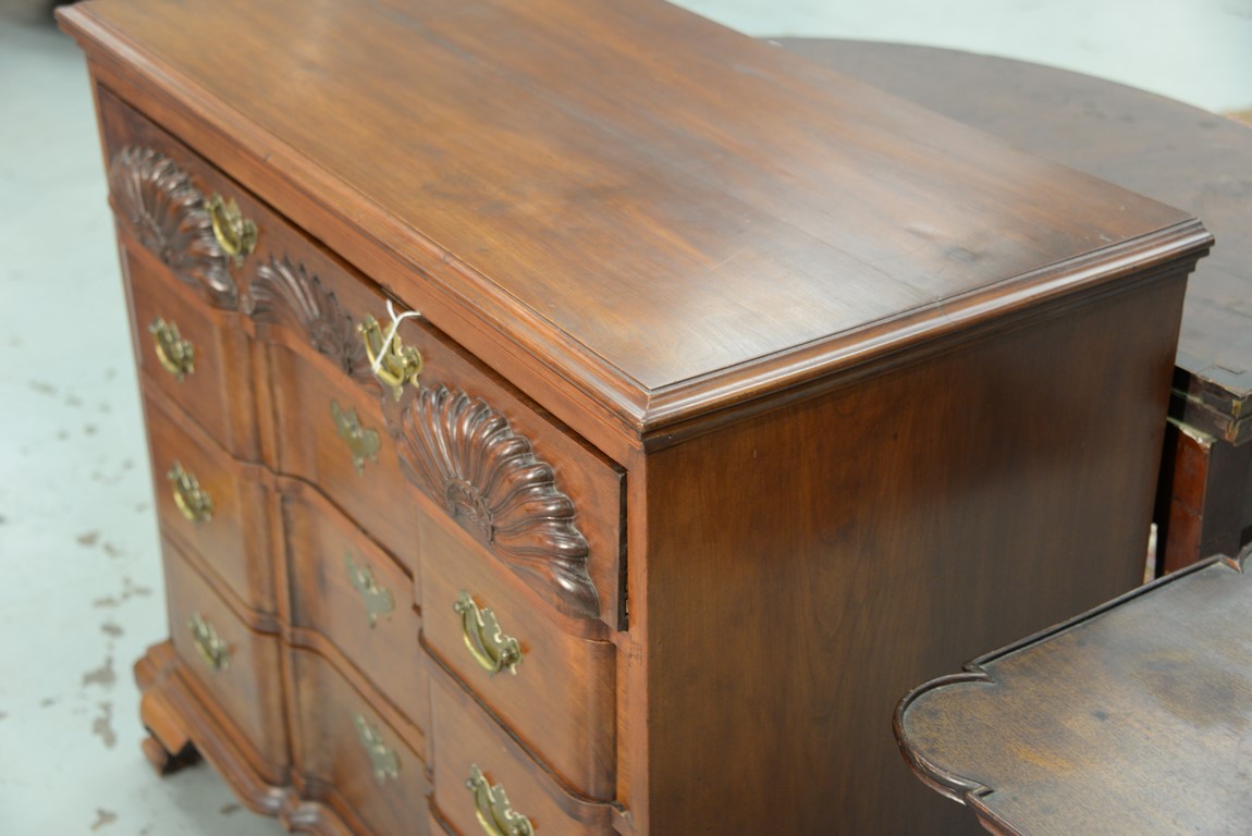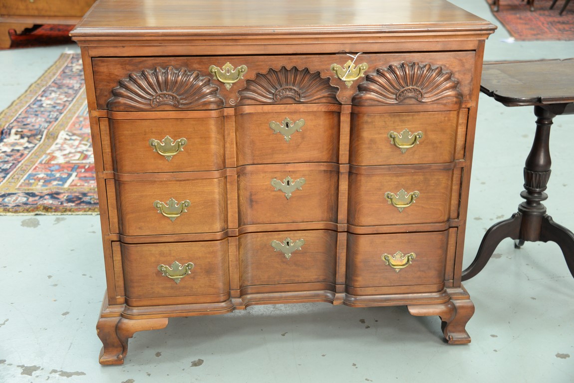 Lot 199: Cherry Chippendale chest having rectangular top over triple shell carved top drawers over three blocked front drawer set on ogee feet restored partially made up. ht. 34 3/4 in. case wd. 37 1/4 in. dp. 18 1/2 in.