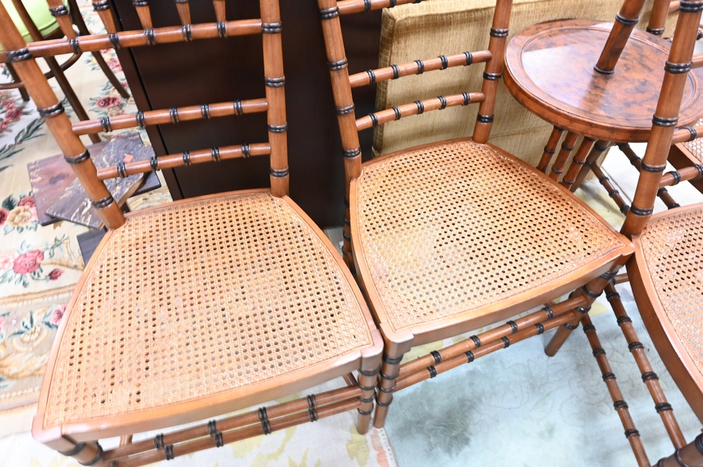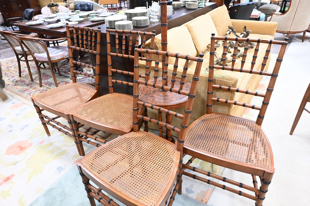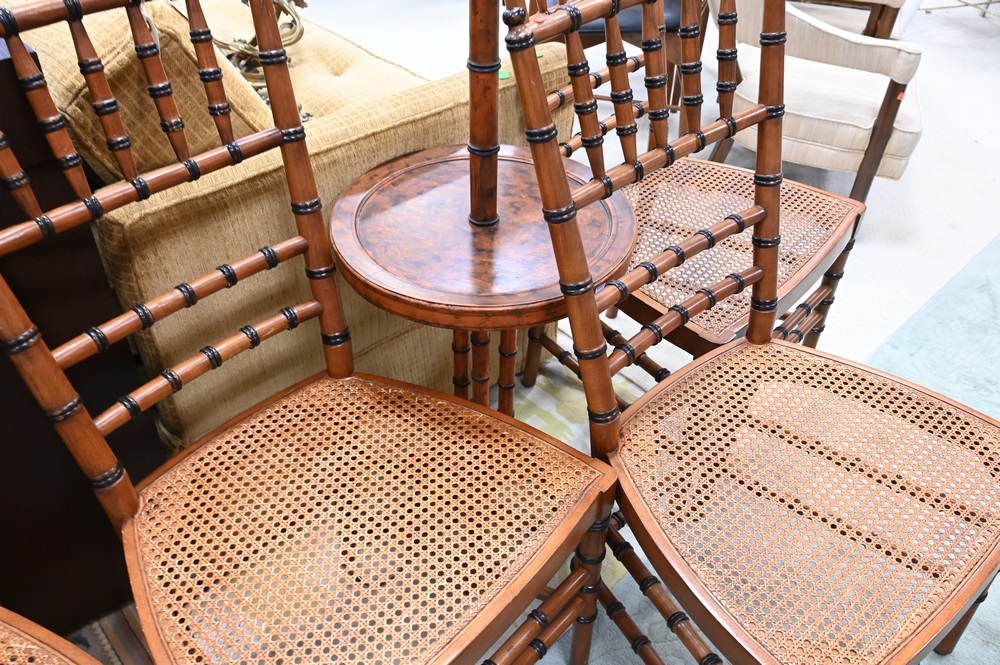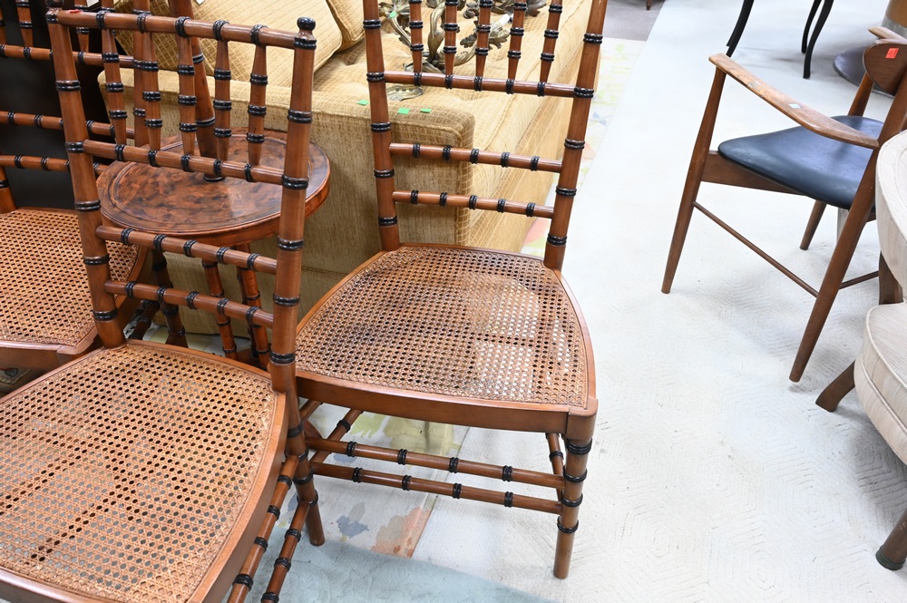 Lot 199: Five Piece Faux Bamboo Lot, to include set of four side chairs with caned seats along with floor lamp, height 61 inches.