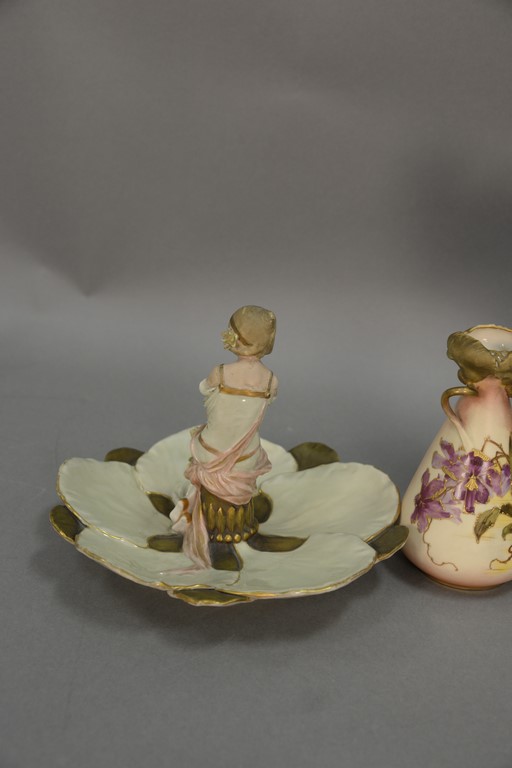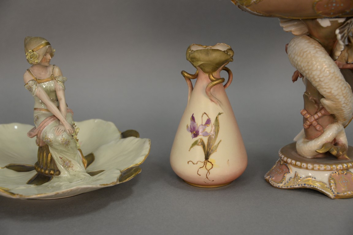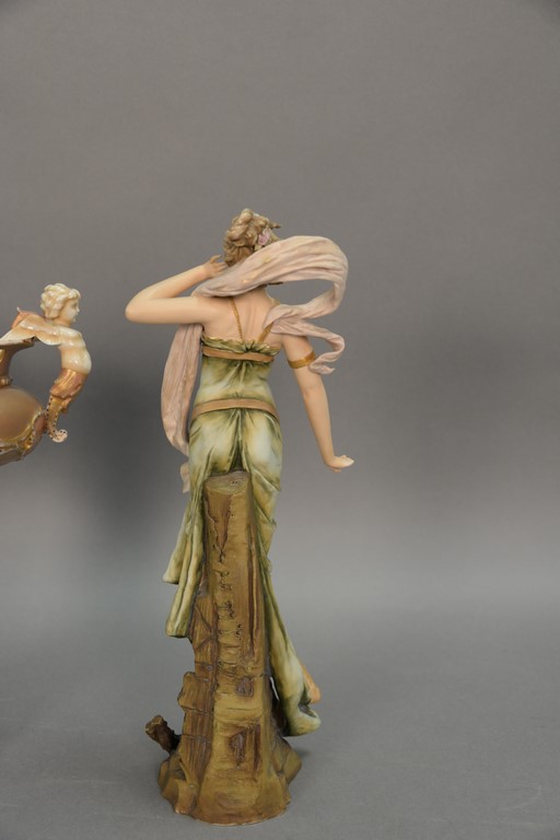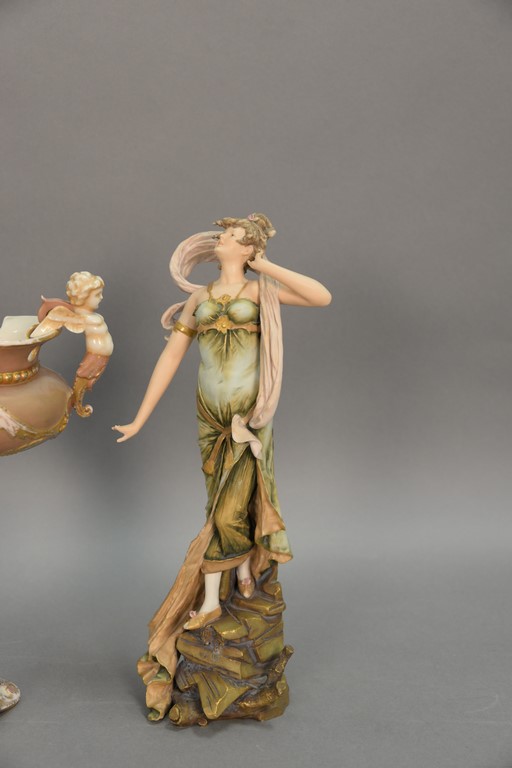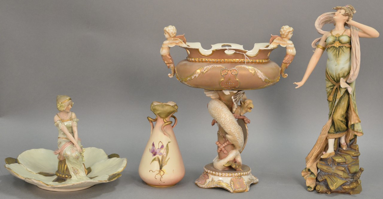Lot 199: Four porcelain painted pieces to include an urn, compote, serving dish, and tall figure of a woman. ht. 7in. to 16in.
