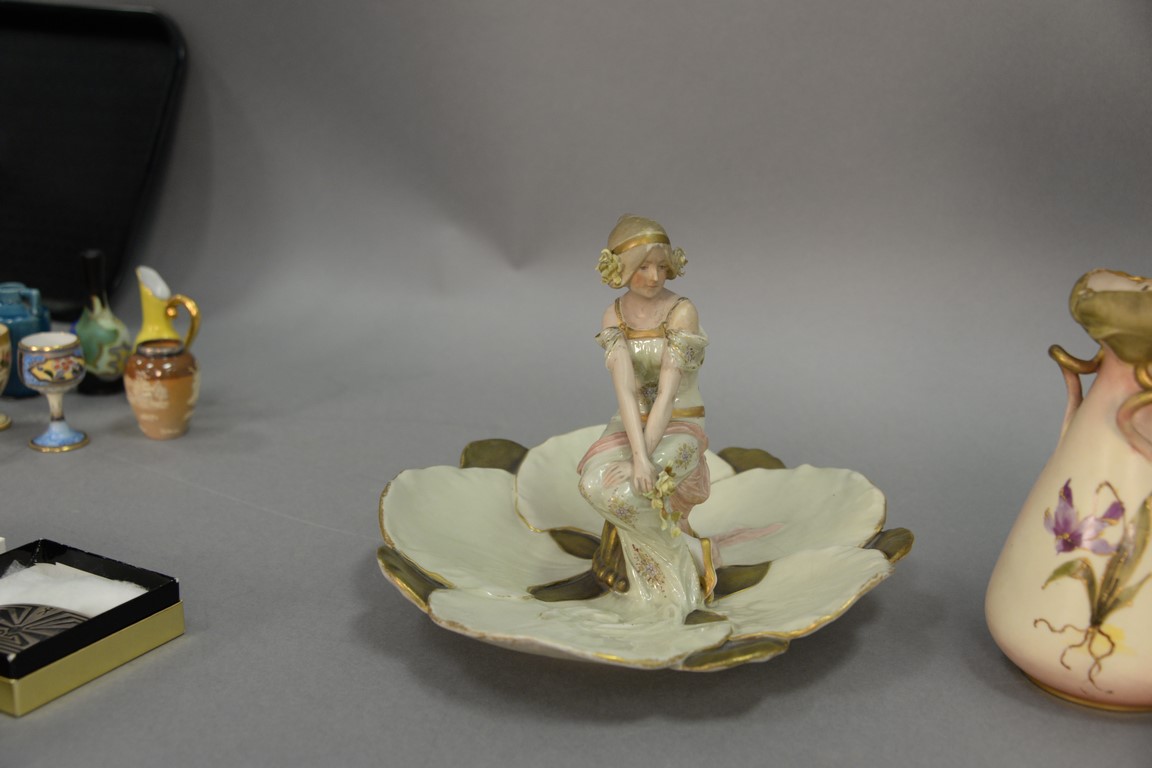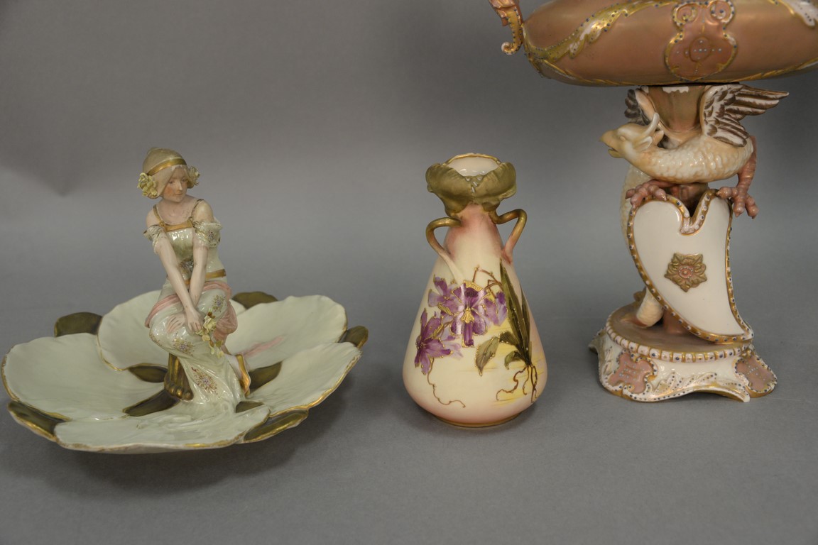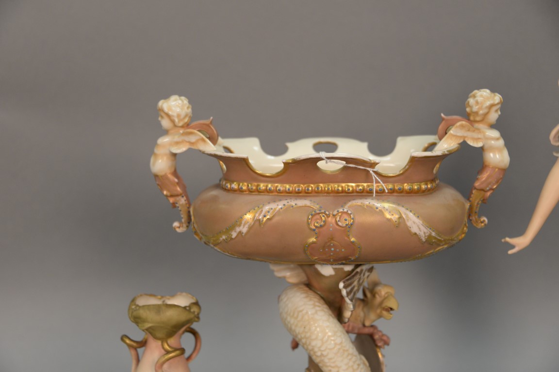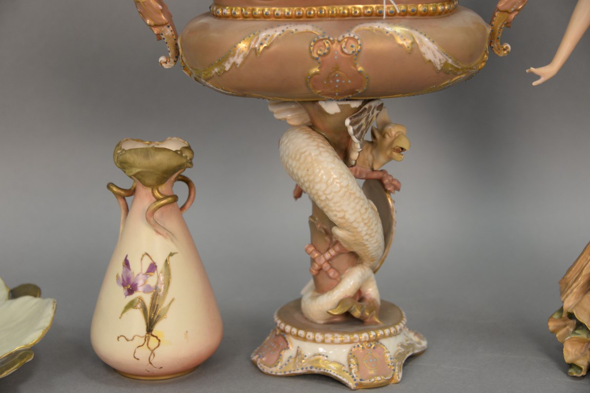Lot 199: Four porcelain painted pieces to include an urn, compote, serving dish, and tall figure of a woman. ht. 7in. to 16in.