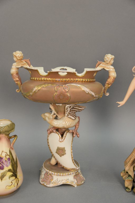 Four porcelain painted pieces to include an urn, compote, serving dish, and tall figure of a woman. ht. 7in. to 16in.