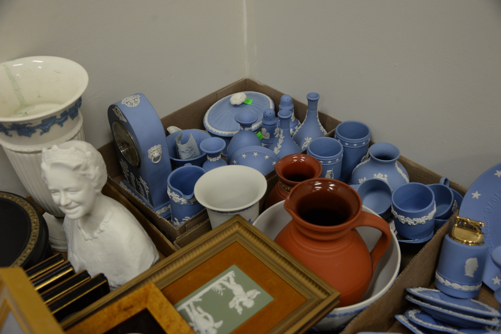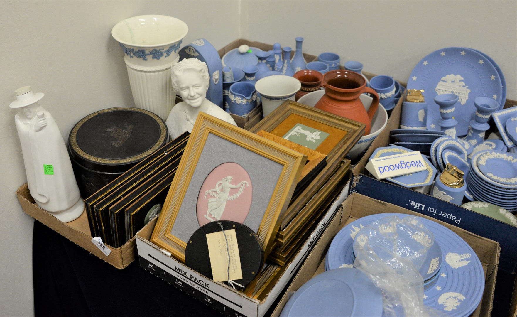Lot 199: Four Tray Lots of Assorted Groups of Wedgwood, to include limited edition Queen Elizabeth bust, black porcelain covered box, pink and white plaque, 12 medallions, rectangle putti figural plaque, along with several other plaques, vase height 10 3/4 inches. Provenance: Estate of James Wadhams.
