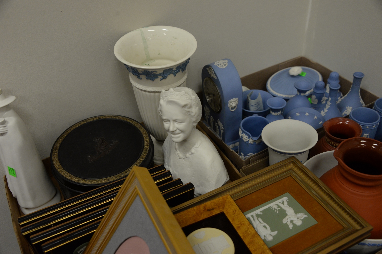 Four Tray Lots of Assorted Groups of Wedgwood, to include limited edition Queen Elizabeth bust, black porcelain covered box, pink and white plaque, 12 medallions, rectangle putti figural plaque, along with several other plaques, vase height 10 3/4 inches. Provenance: Estate of James Wadhams.