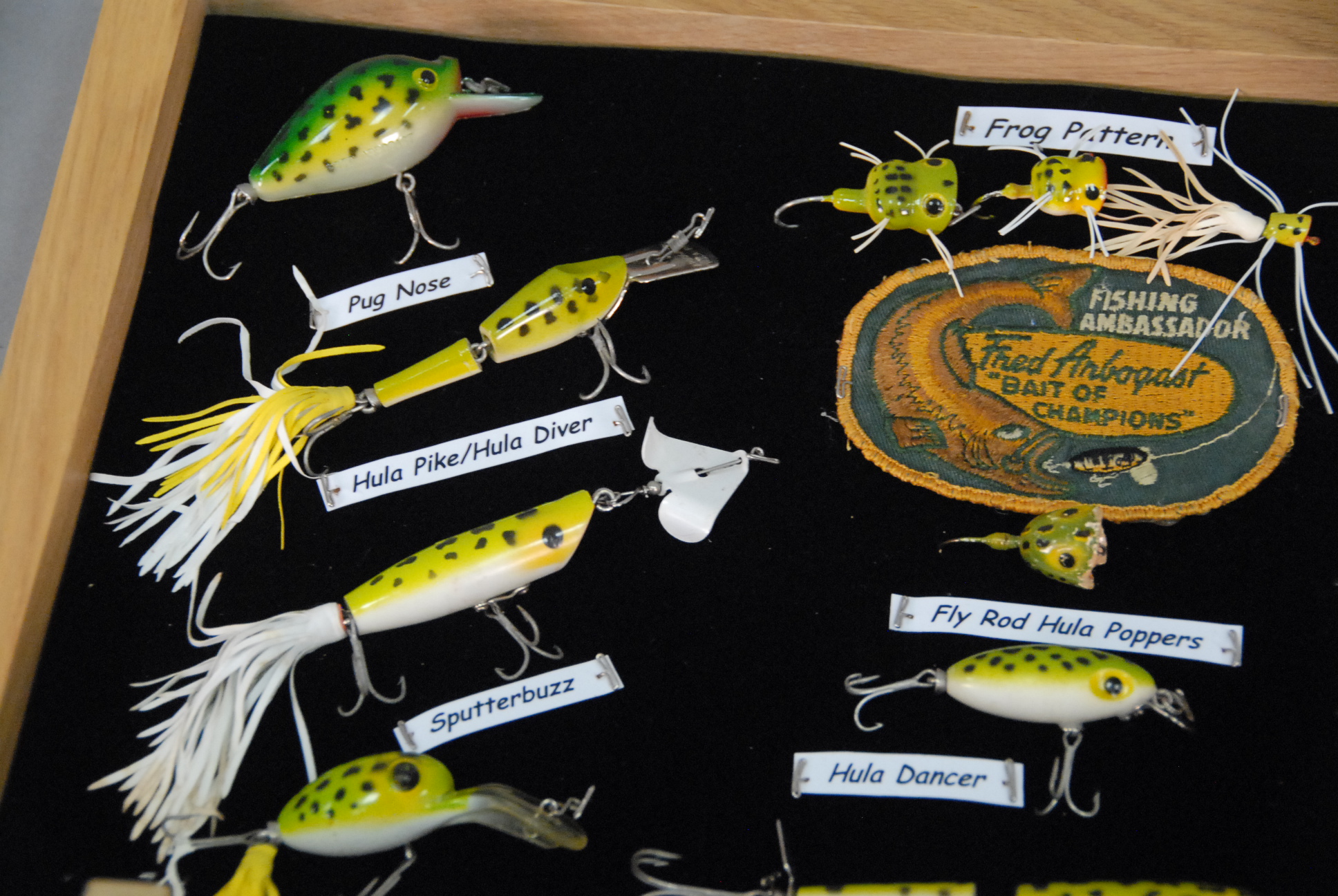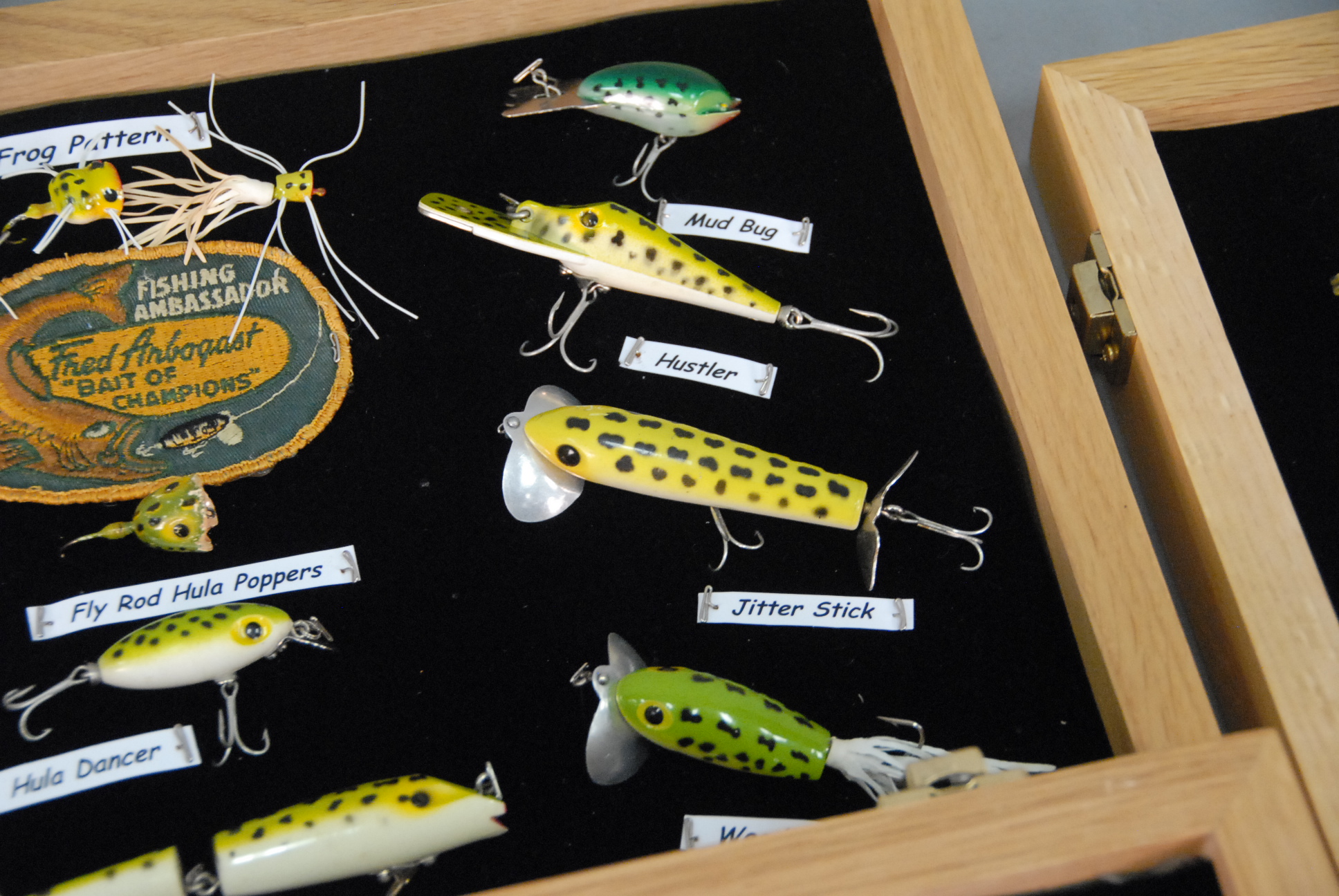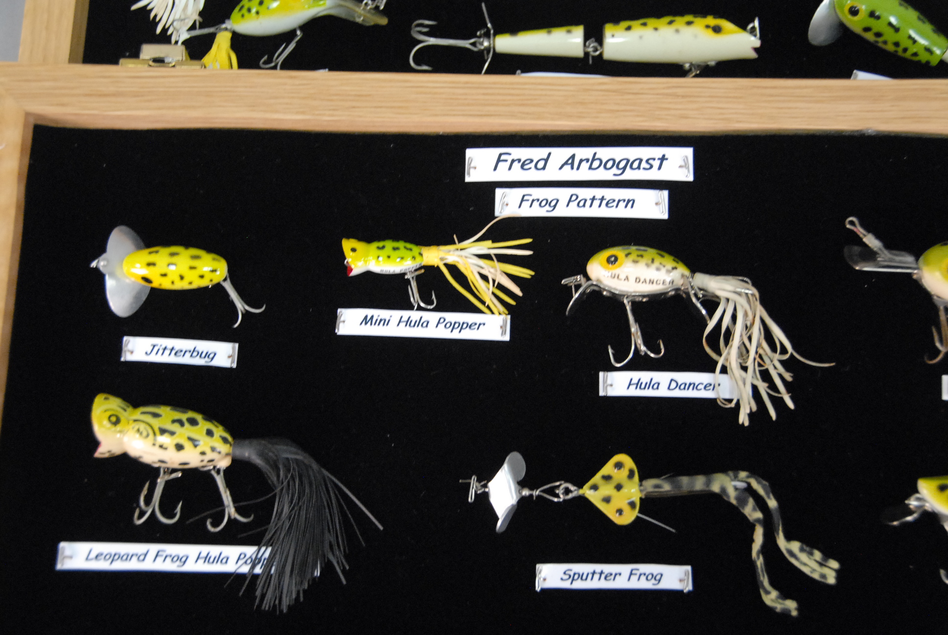 Fred Arbogast thirty-one Frog Patterns in three custom cases include Pug Nose, Hula Pike Sputterbuzz, Bug Eye, Fly Rod Hula, Mud Bug, Hustler, Jitter Stick, Weedless Jitterbug, Hula Dancers, Sputterfuss, Rib Lip, Arbo-Gaster, etc.